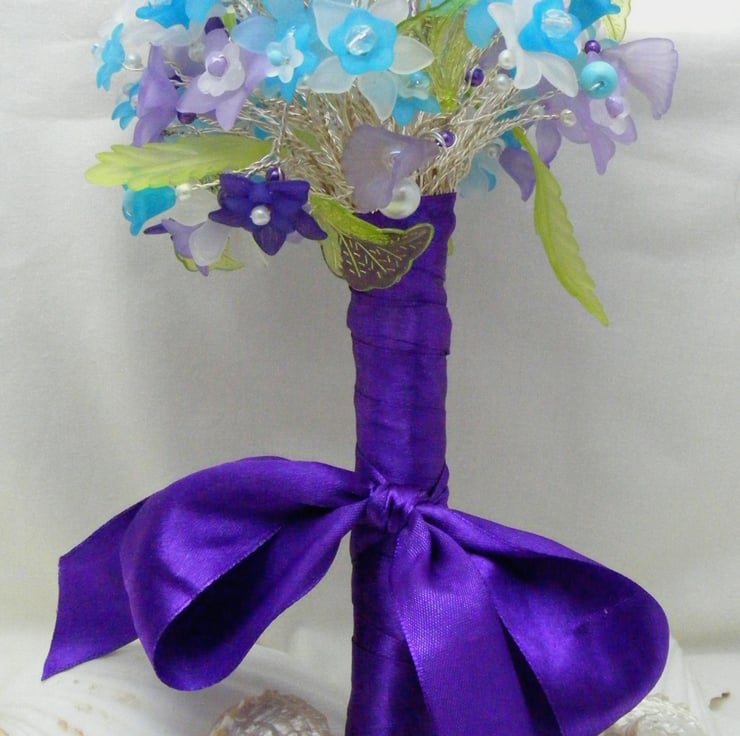 This beautiful bouquet would make a lovely gift for mother's day, birthdays, weddings or any other occasion. These flowers will last a life time. Bouquet's made with, 27mm and 15mm dark purple and turquoise Lucite flowers, 27mm, 12mm, 15mm and 10mm white Lucite flowers, 50x16mm spring green Lucite leaves, 27mm, 17x19mm, 17mm, 15mm and 10mm lilac Lucite flowers, 4mm dark purple, turquoise and clear fire polish glass beads, 4mm dark purple and white glass pearls, 6mm turquoise, white and dark purple glass beads,