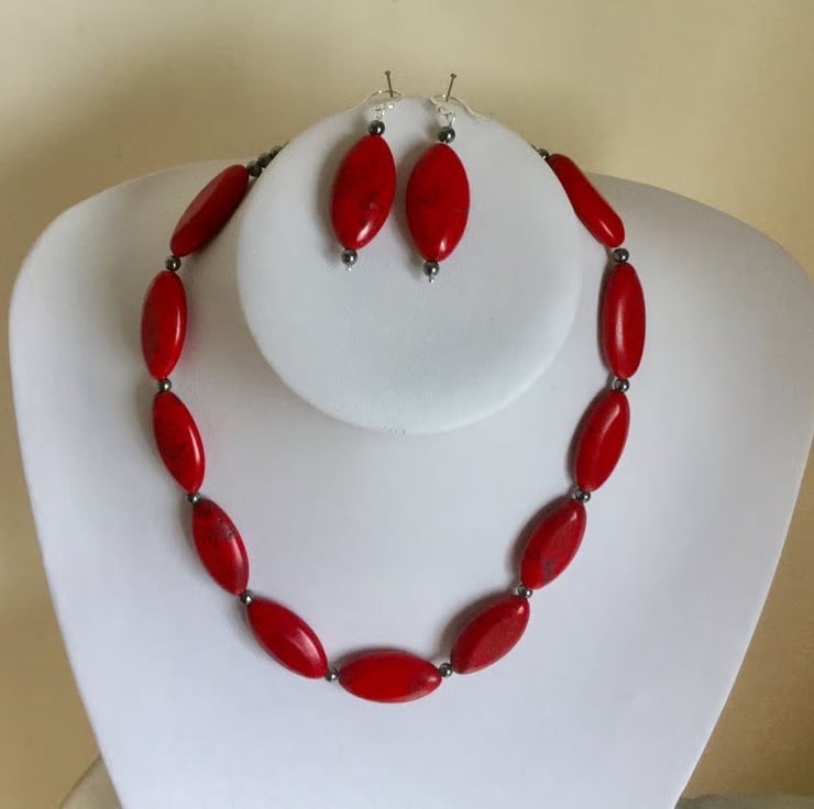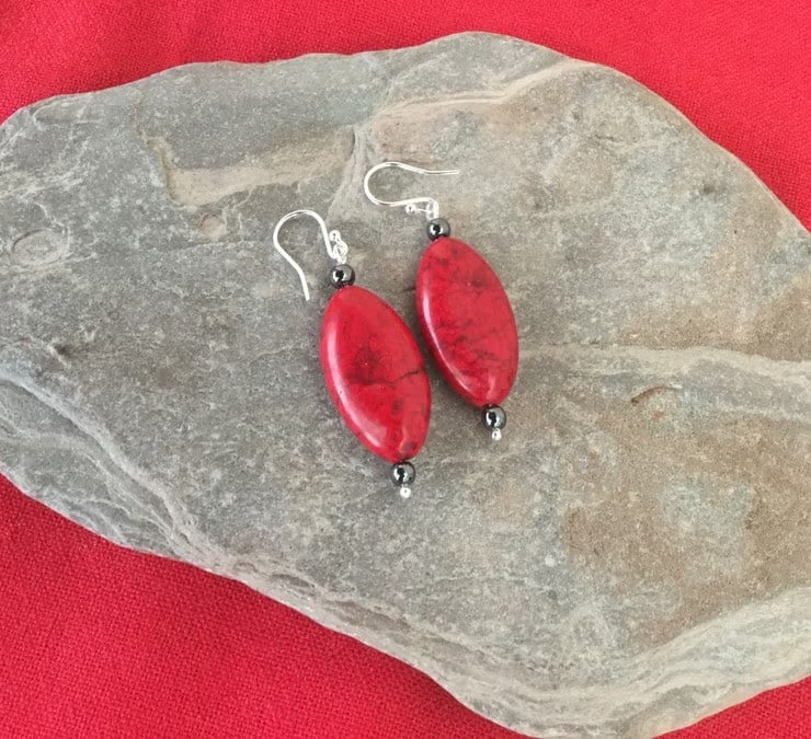 These spectacular drop earrings feature chunky gemstone beads of red magnesite with sterling silver findings. The boat-shaped marquise beads are about 3cm, 1.2inches in length, a bright rose-hip red in colour with dark veining. They have a lovely smooth curved surface with a satin sheen.