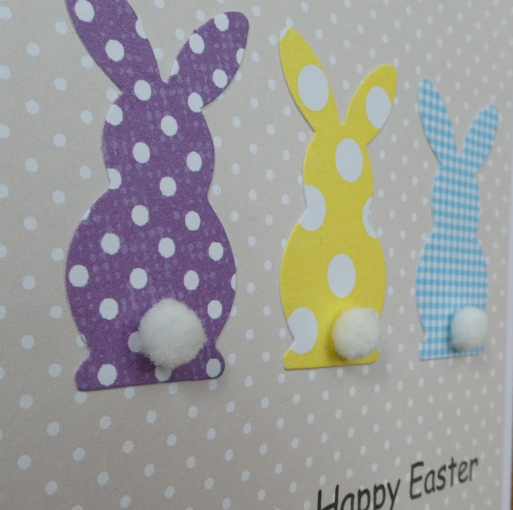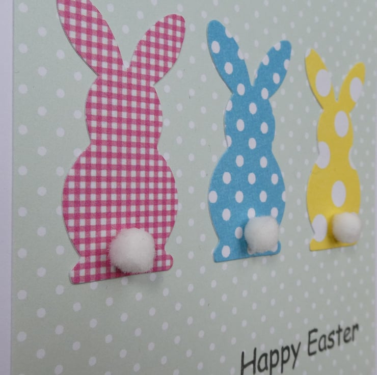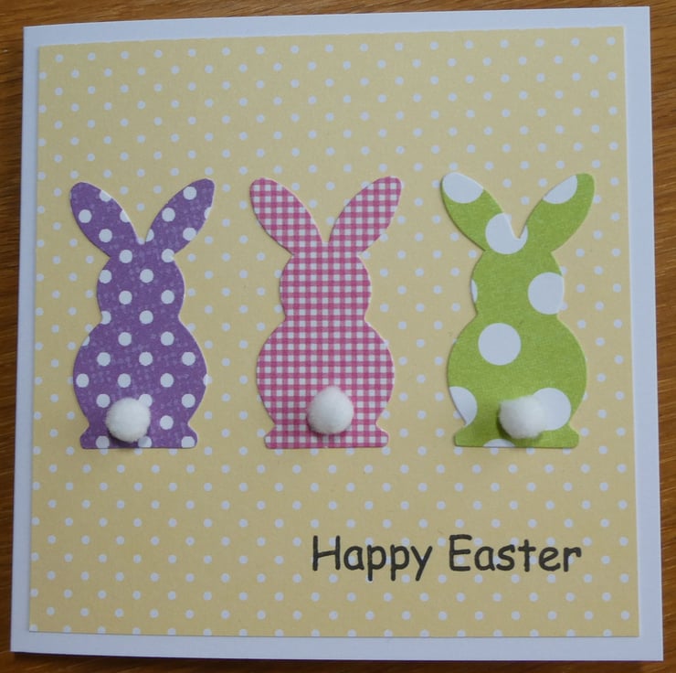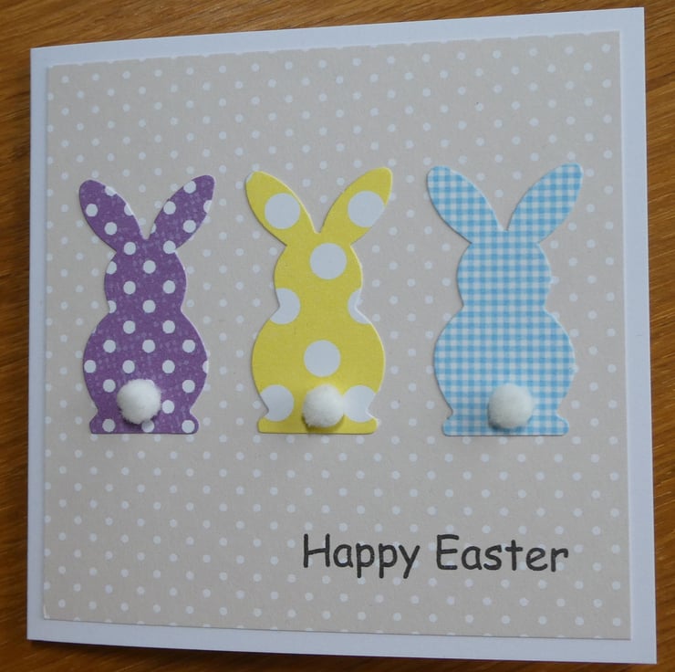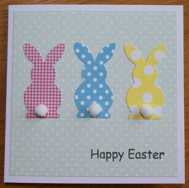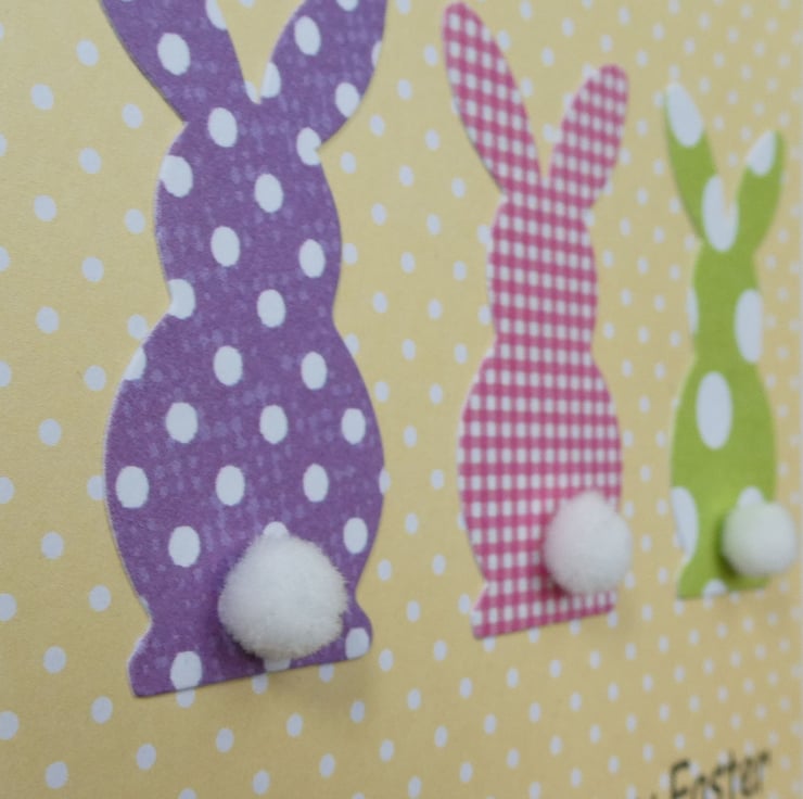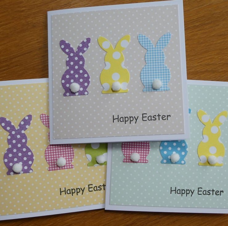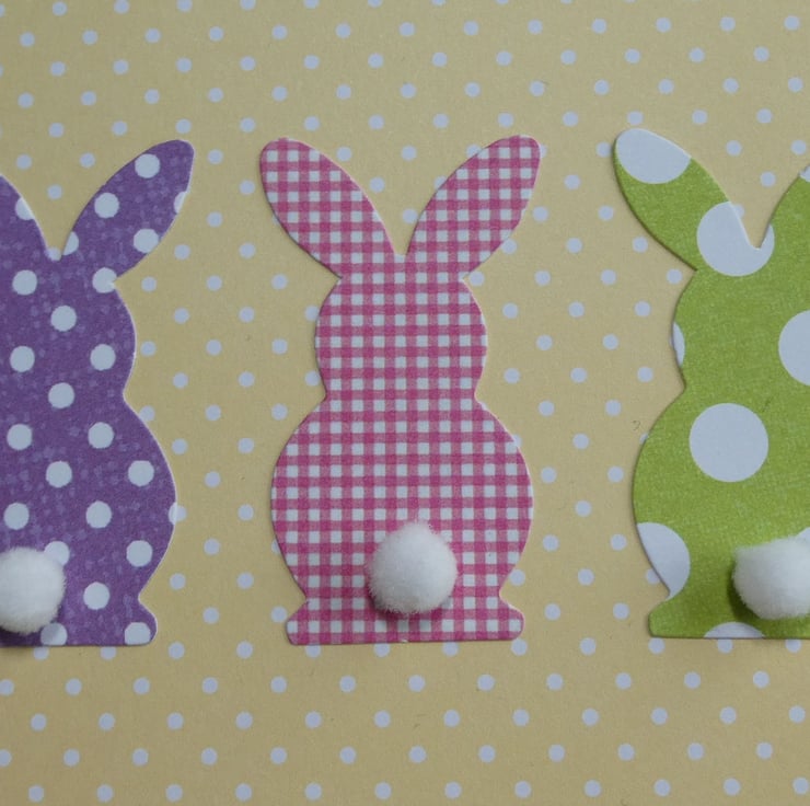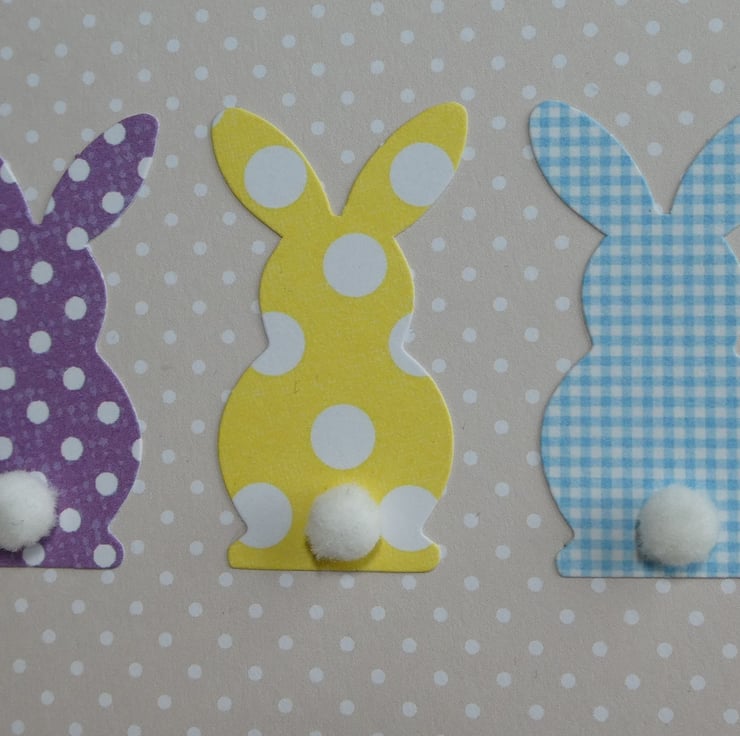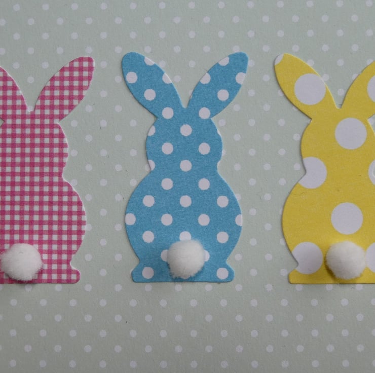 Each card has a square of polka dot card with a row of 3 bunnies die cut from patterned card all with tiny white fluffy pom pom tails.