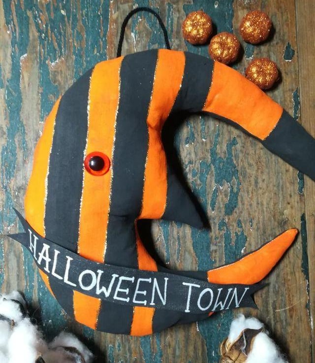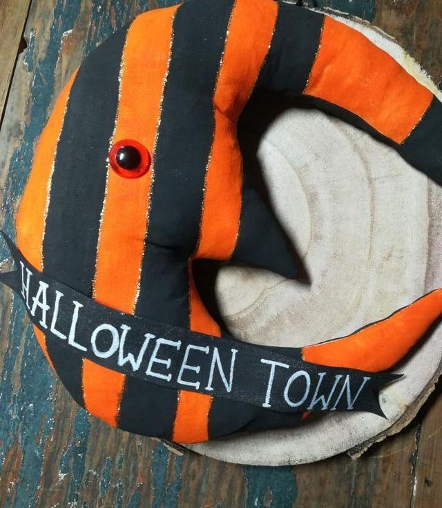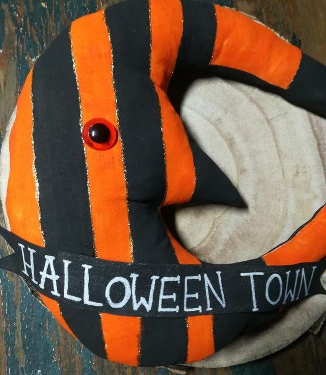 Hand painted in black and orange stripes with glitter, orange eye and a hand painted Halloween Town banner.