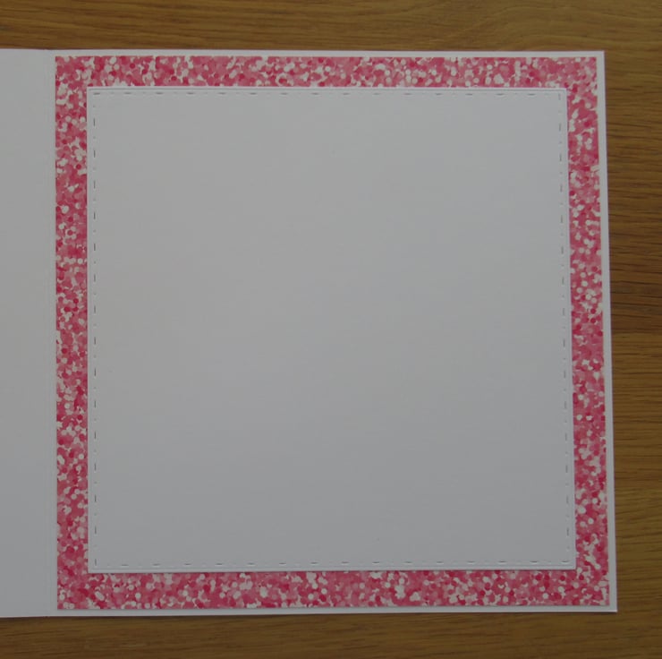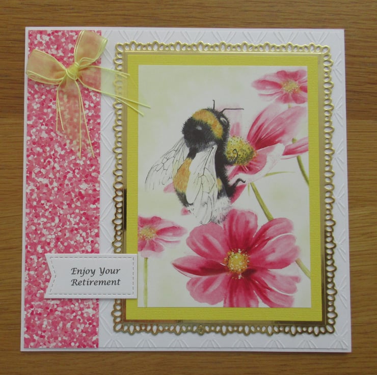I started this card by embossing the white background card to give added texture. A decorative frame was cut from gold mirror card upon which I placed the beautiful image of a bumble bee collecting pollen from some pink daisies. A deep pink speckle effect border was added to one side of the card along with a Retirement greeting and a yellow organza bow. I finished the inside of the card to coordinate but it has been left blank for your own message.