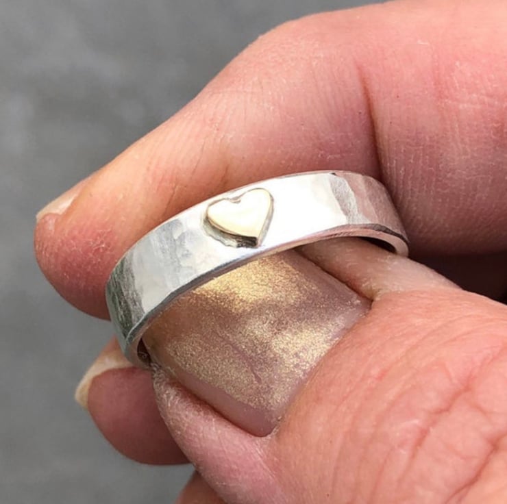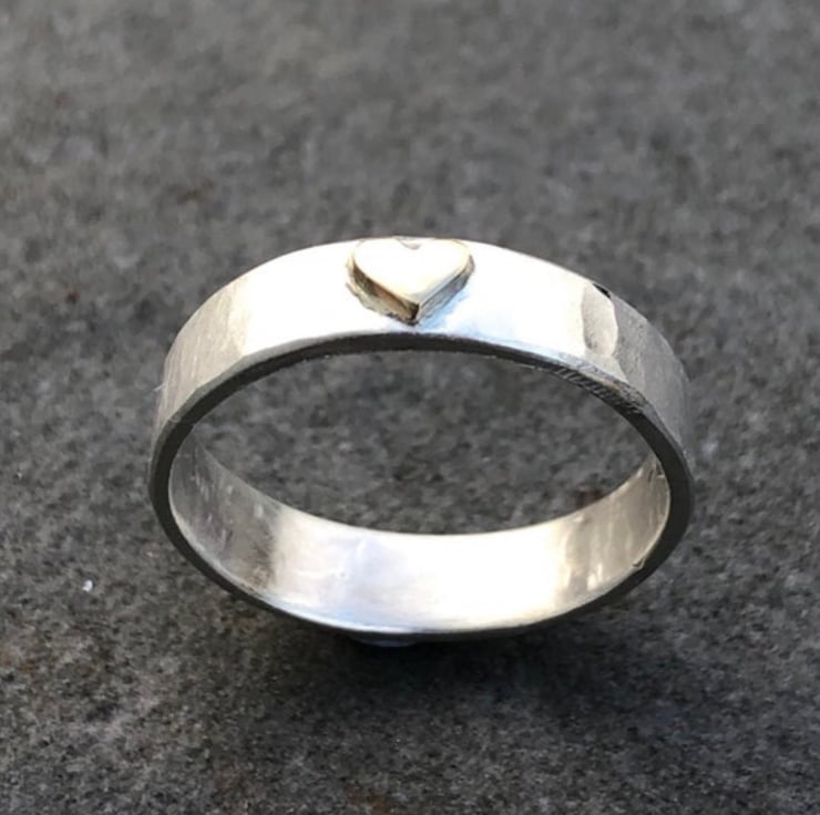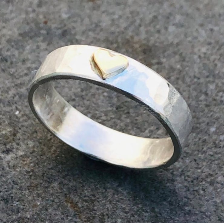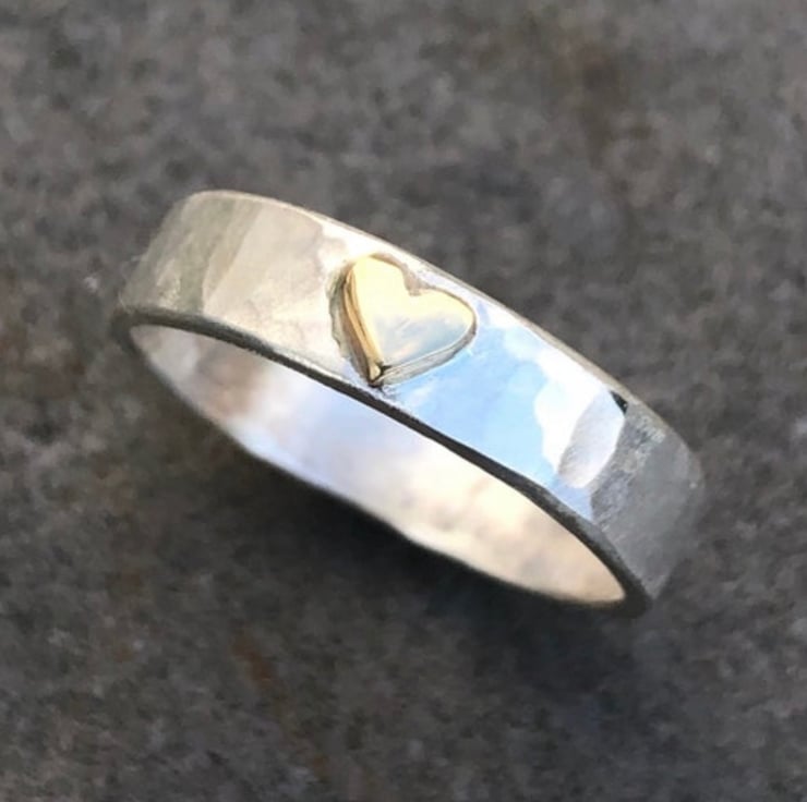 This gold heart ring has a Sterling Silver hammered, matt finish and measures approx: 5mm in width with a 9ct yellow gold heart. The ring is part of the ‘Ace of Hearts’ Collection which also features necklaces, earrings and bangles. Please let me know the size you need at Checkout or message me. Also let me know whether you used a narrow ring sizer (approx: 4mm in width) or a wide ring sizer (approx: 6mm wide). This ensures a perfect fit. If you would like the silver shiny at her than matt please message me.