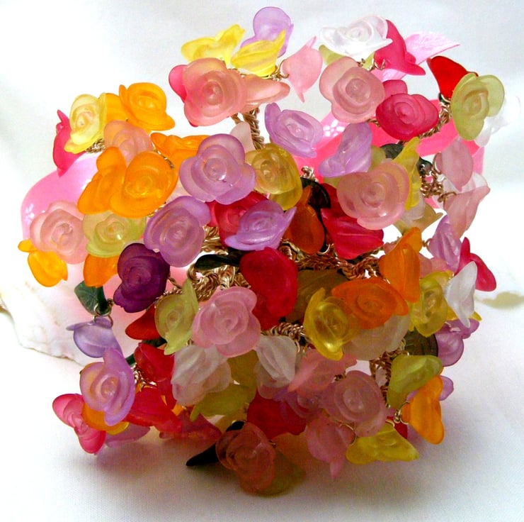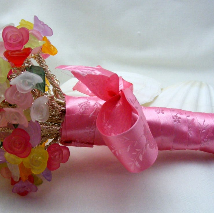 I have handmade this bouquet with, 16mm red, fuchsia, lilac, orange, pale pink, white and yellow Lucite rose flower beads, 15x10mm dark green Lucite leaves, silver plated wire, pink patterned ribbon and glue. Added to the sale, as didn't quiet turn out as I had wanted.
