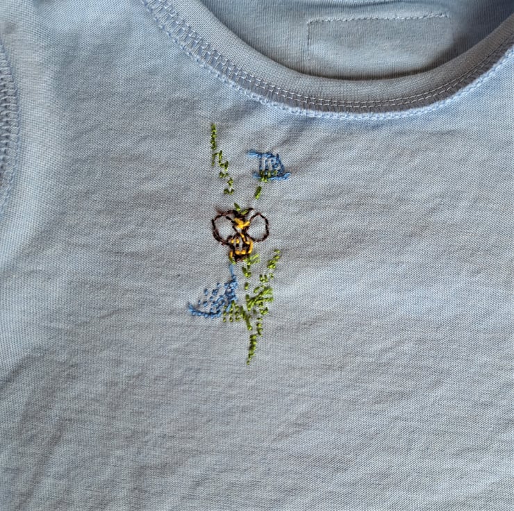 I have hand embroidered a bee on the left breast of this lovely light blue T-shirt. It is visiting blue cornflowers. As I never use a permanent backing when hand stitching children's clothing, there is nothing inside this shirt to irritate your child's skin.