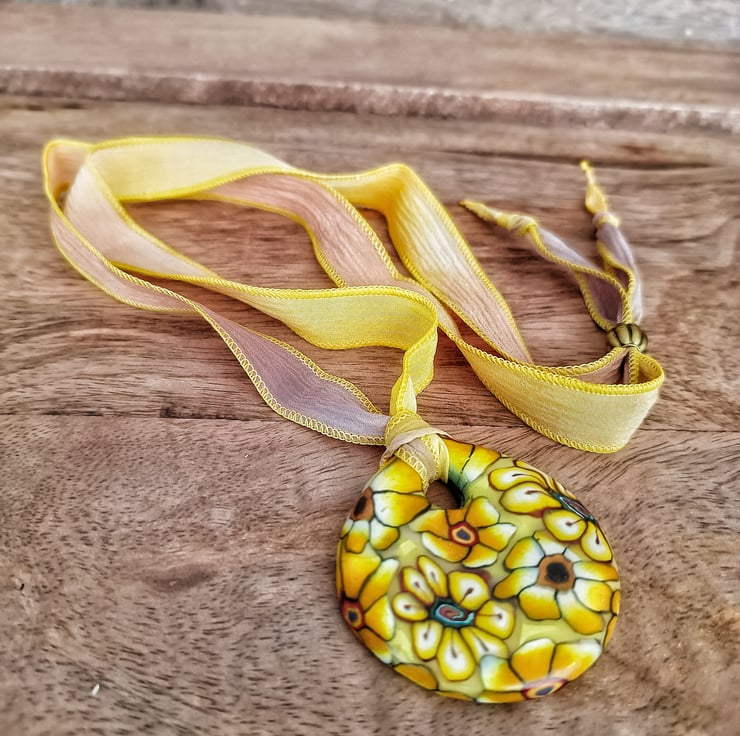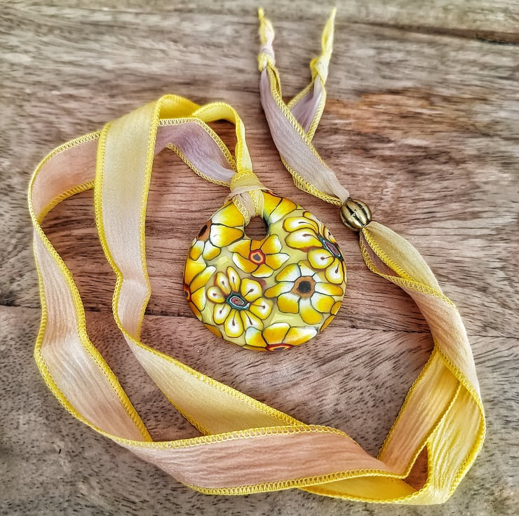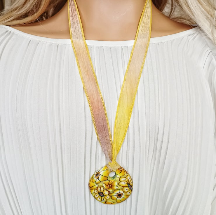 A stunning necklace featuring a lovely hand painted polymer clay pendant. The Silk Ribbon is Pure Silk, Crepe de Chine Silk Ribbon and has been hand painted in yellow and beige, for a smooth surface and elegant shimmer. This necklace is worn without the need to fiddle with a clasp. The silk ribbon slips over the head with ease and the end bead slides up and down at your preference.