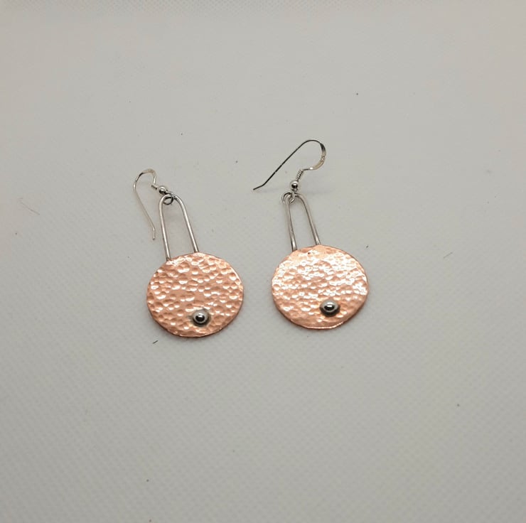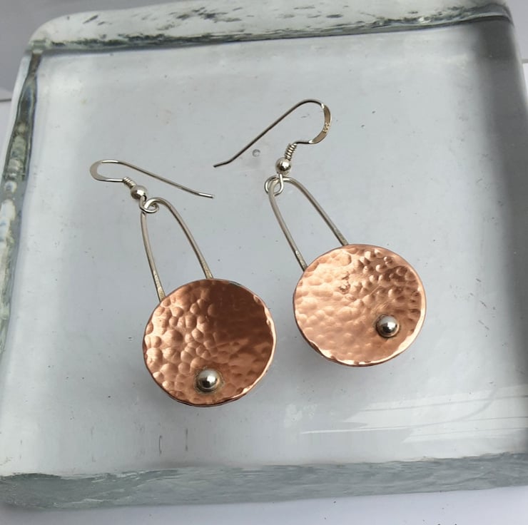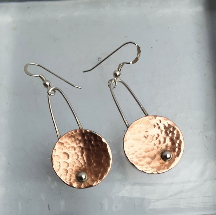 These lovely earrings are full of movement and compliment most outfits and hair lengths. The copper discs, which measure 20mm in diameter have soldered, fine silver bobbles on each earring. They are then soldered onto sterling silver wires and ear hooks. A quick 'huff and puff' will keep them shiny and eye-catching.