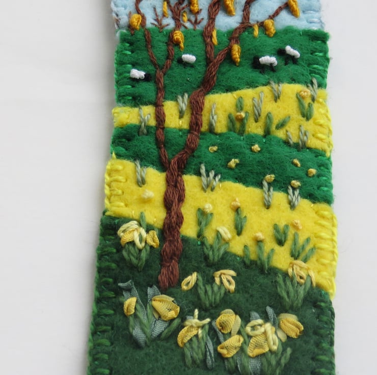 I love stitching little landscape scenes. This one on felt - some of the felt scraps are commercial offcuts. This design features daffodils, those in the foreground stitched in silk ribbon. A tree with catkins and tiny sheep add further interest.