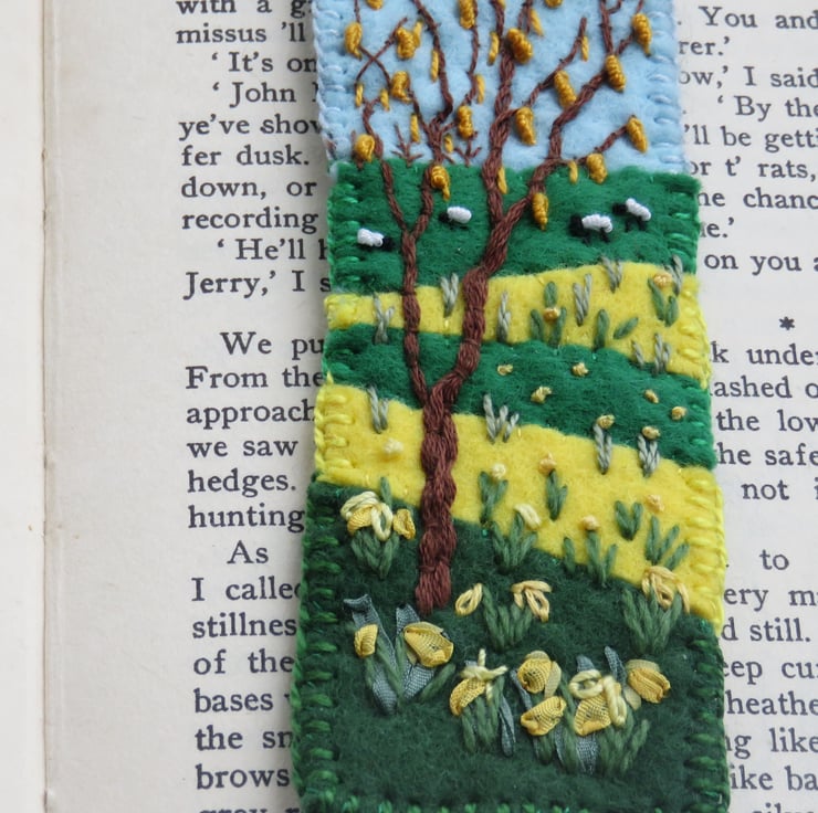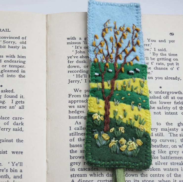 Daffodils,catkins and tiny sheep have been handstitched, in a combination of vintage threads and silk ribbons, onto this pretty bookmark. An easy-to-post gift for a book-loving friend.