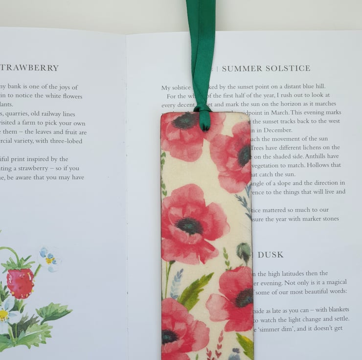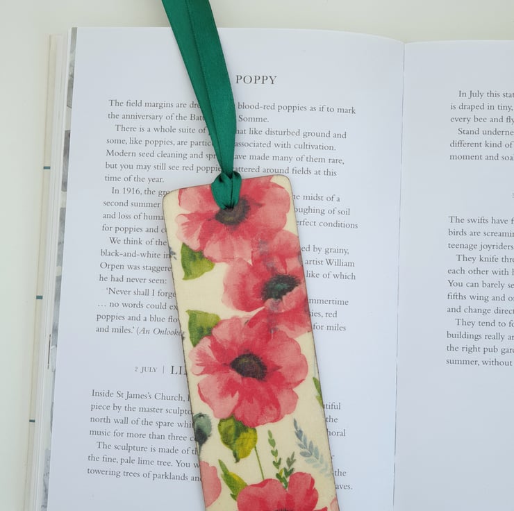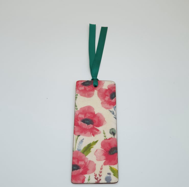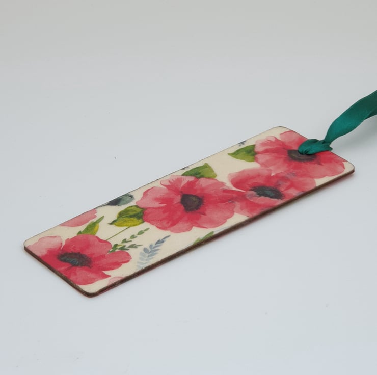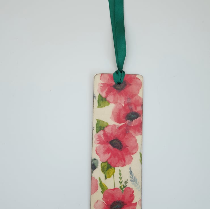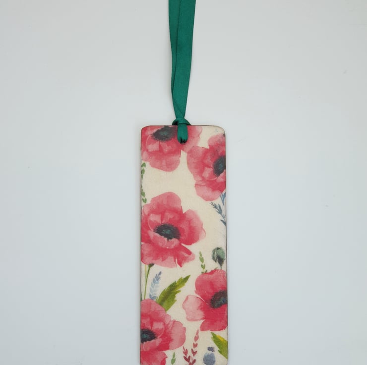 Pretty poppy bookmark. The bookmark is made of wood and has been decoupaged on both sides with poppies. Each side is slightly different. The design has been sealed and finished with green satin ribbon.