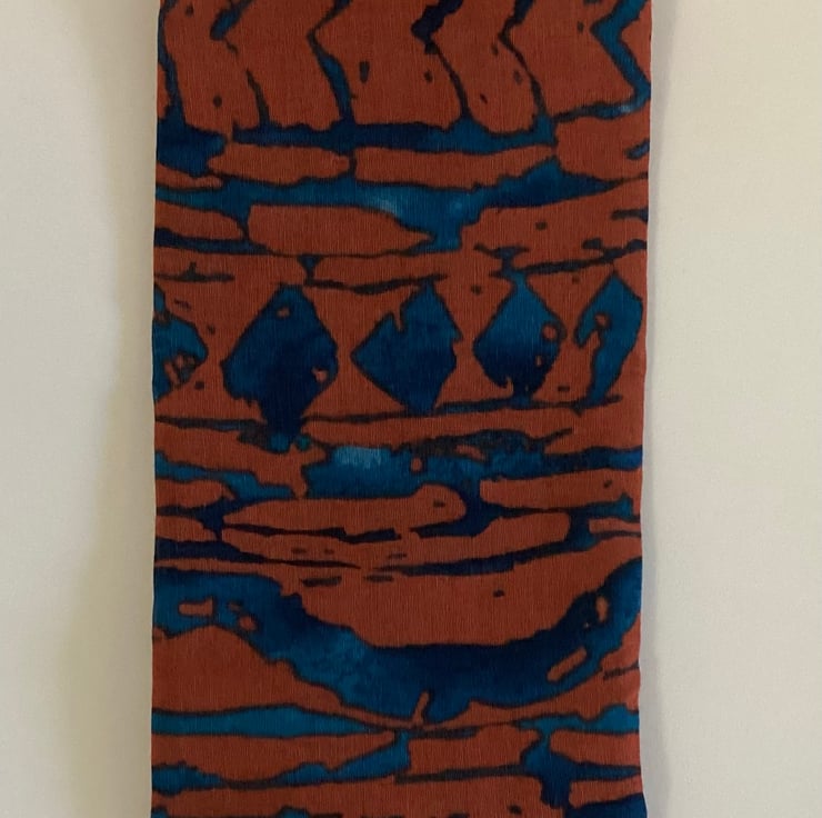 This glasses, sunglasses case outer is chiffon with a burnt orange background and a blue abstract pattern. The case is lightly padded and lined with turquoise felt. It has a button and elastic loop closure.