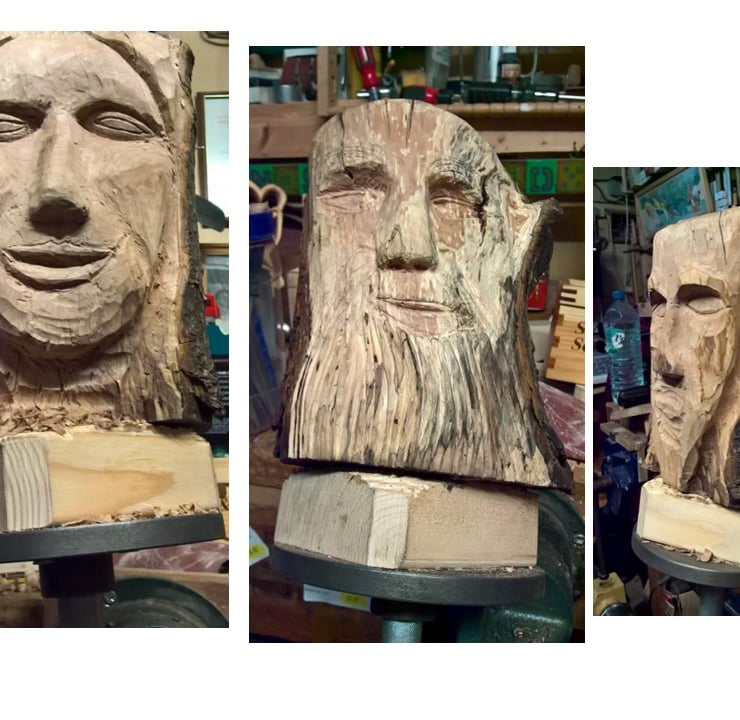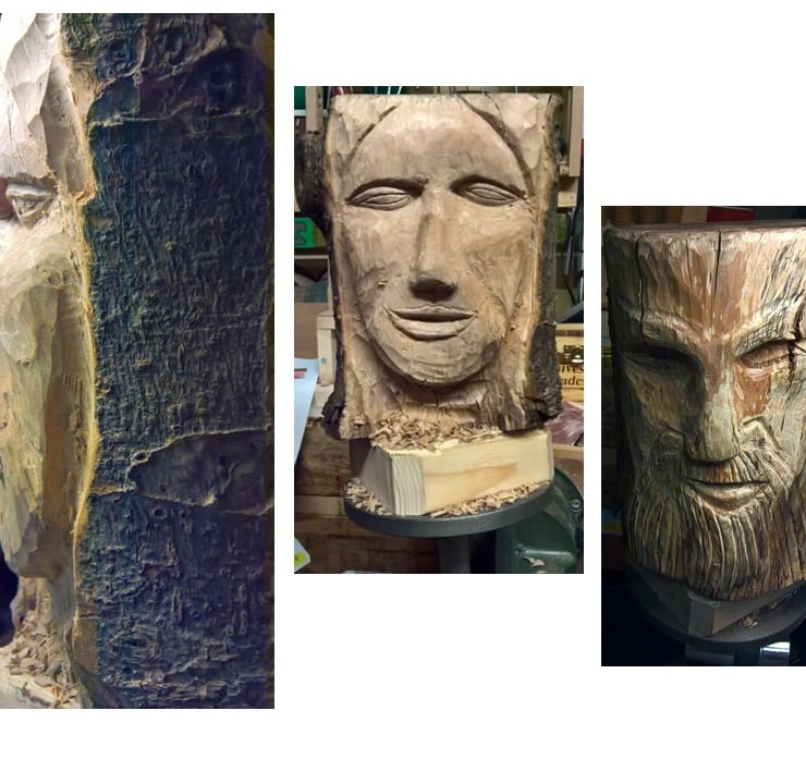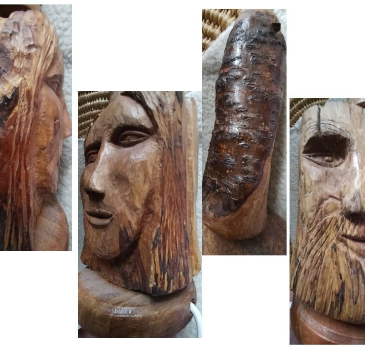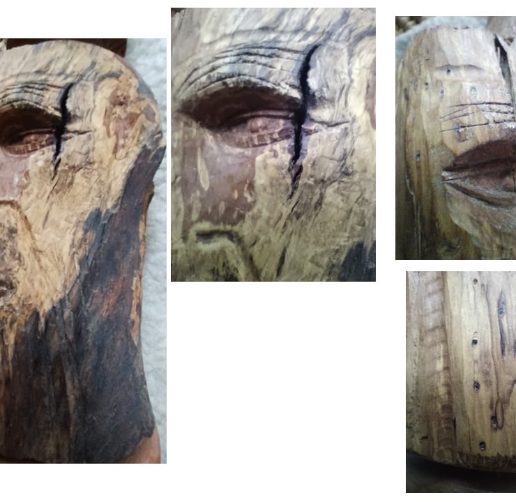 An exploration of craft skills, in this case wood carving and wood turning....I particulary like the way the faces are off centre... this was dictated by the wood grain as the carving unfolded... and I love the bark looking so georgeous... the wood worm holes, the spalting, the shakes, mother nature is marveous...it was treated with ronseal woodworm treatment before I started carving and no new worm holes have started since I sealed it with varnish and wax...it is a unique peice....an "objet d'art"....but beauty is in the eye of the beholder....