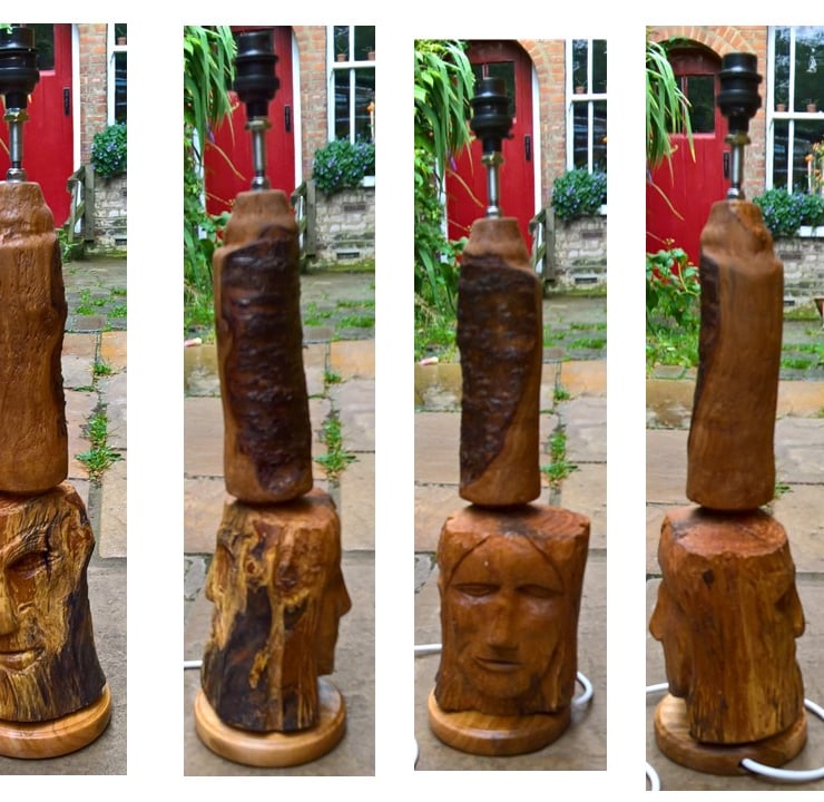 I found a lovely spalted and worm eaten log in the wood pile. After treating it with woodworm stuff, I enjoyed carving it.... (I don't think my clumsy carving skills do the piece justice...but hey ho!)...To me this is a celebration of mother nature...the splits in the timber (Shakes, I think they are called),,,the wood worm holes (now filled with sawdust and linseed oil, which is the finished that has hardened up the timber as well as bringing out the grain). The bark on the upright, the round turned simple base...it is a lovely piece. When used as a table lamp the shadows enhance the features and I loved turning it round to view different aspects periodically. It is second hand, as I used it for months. As I am not an electrician I will remove the plug and the buyer will have to get a competent person to ensure it is ok to put the plug on...I would recommend a pat test, which we used to to do with a special machine at the school I taught at... the electrics are all good quality from B&Q and I have tested it with a mega and used it for a few months, so I am happy it is well put together an d safe....but I am not a qualified PAT tester.... hence I will remove the plug...