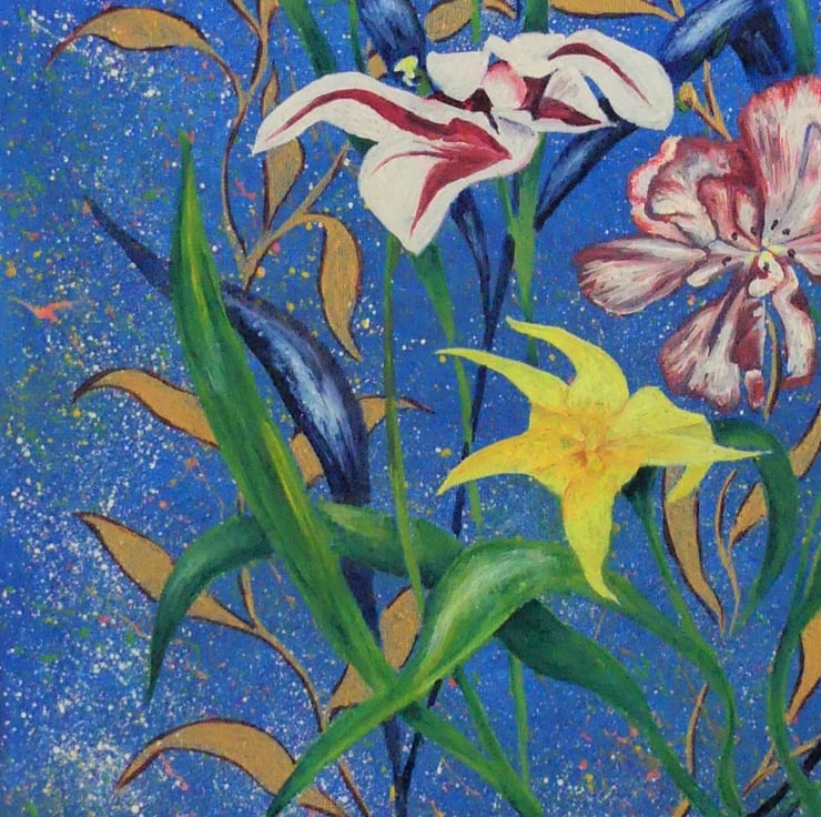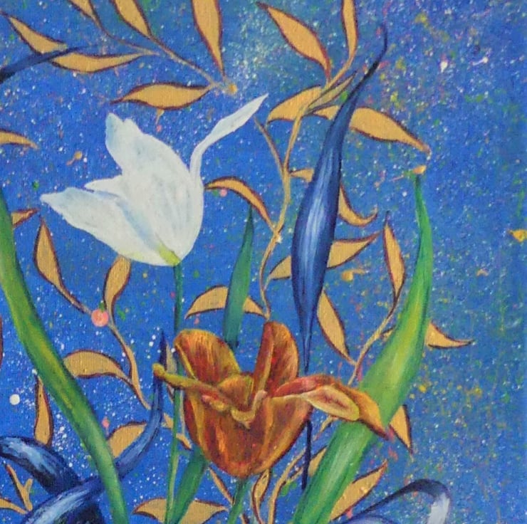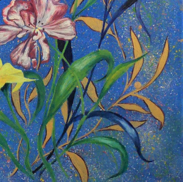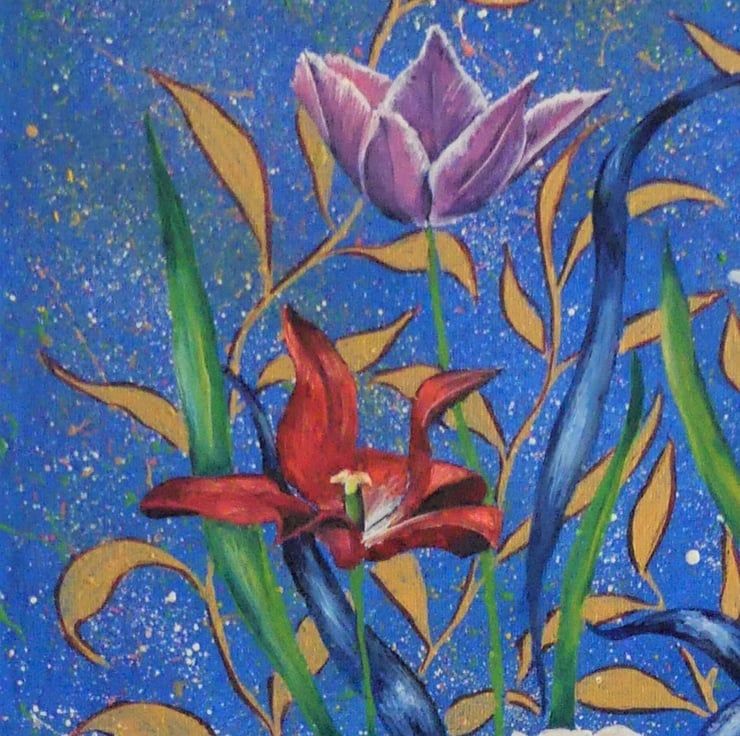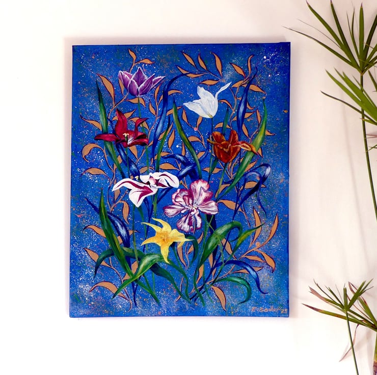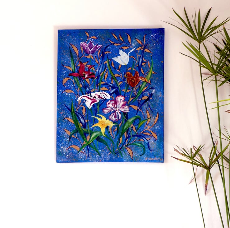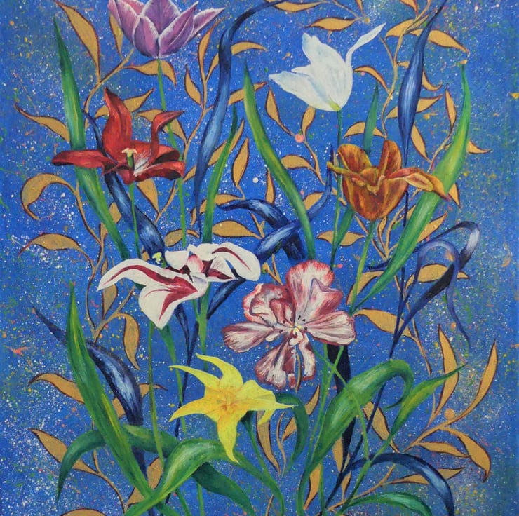 A decorative botanical original oil painting of brightly coloured spring tulip flowers.