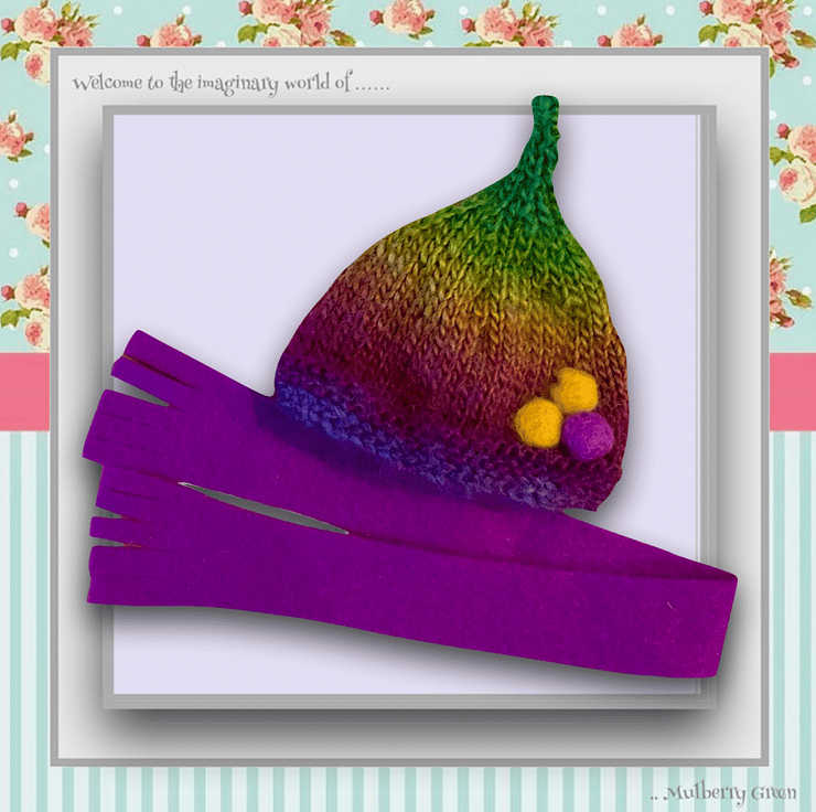 A lovely soft rainbow shaded hat, decorated with little felt balls, to fit the Mulberry Green characters. The hat comes with a matching felt scarf..