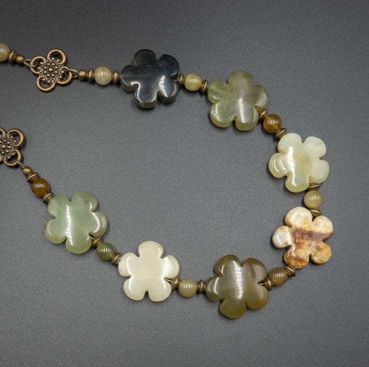 Natural jade earthy tone 20mm carved flowers, antique tone bronze spaces and smooth round 8mm and 6mm beads are used for this striking and bold necklace.