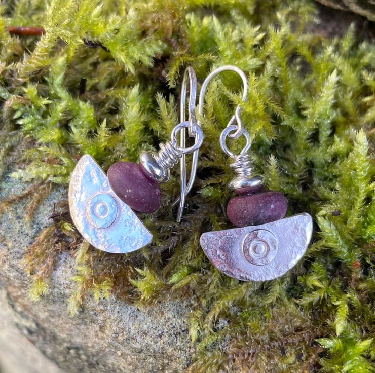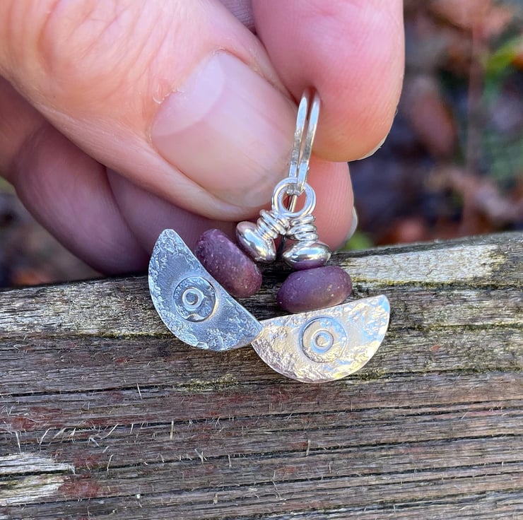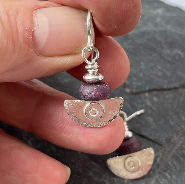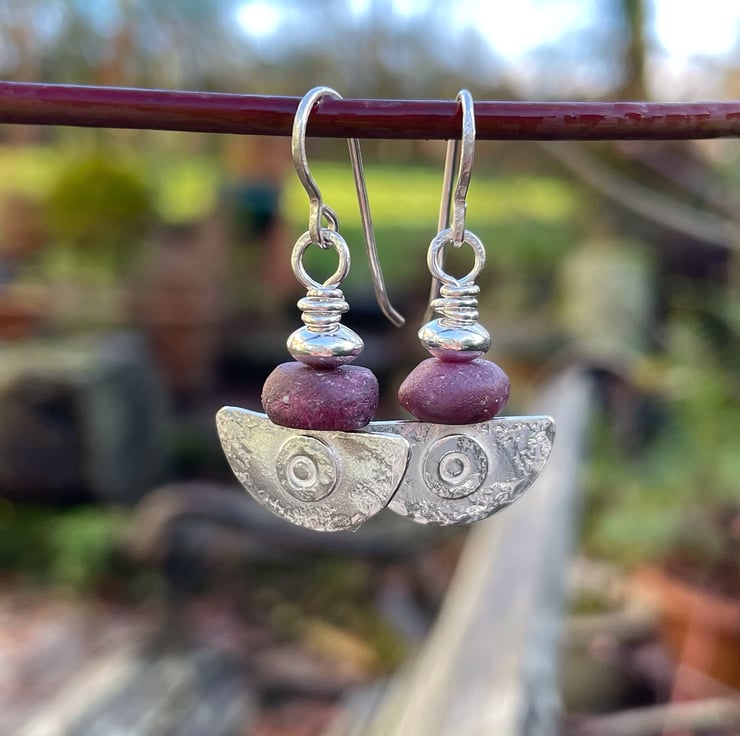 Small lightweight ,comfortable drop earrings topped with unpolished opaque dark pink ruby beads.