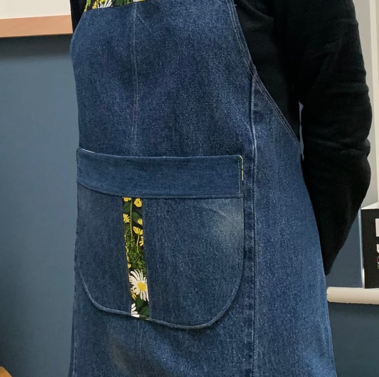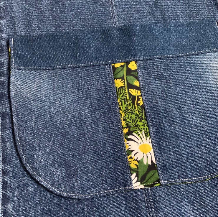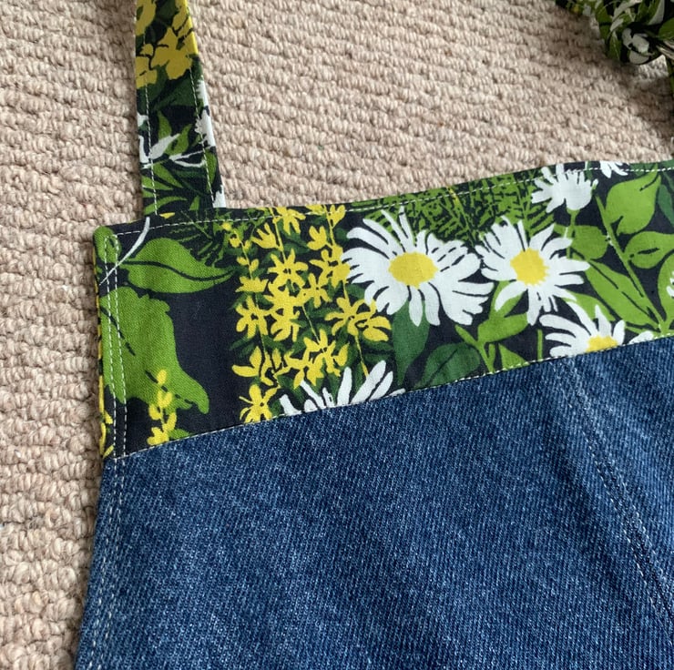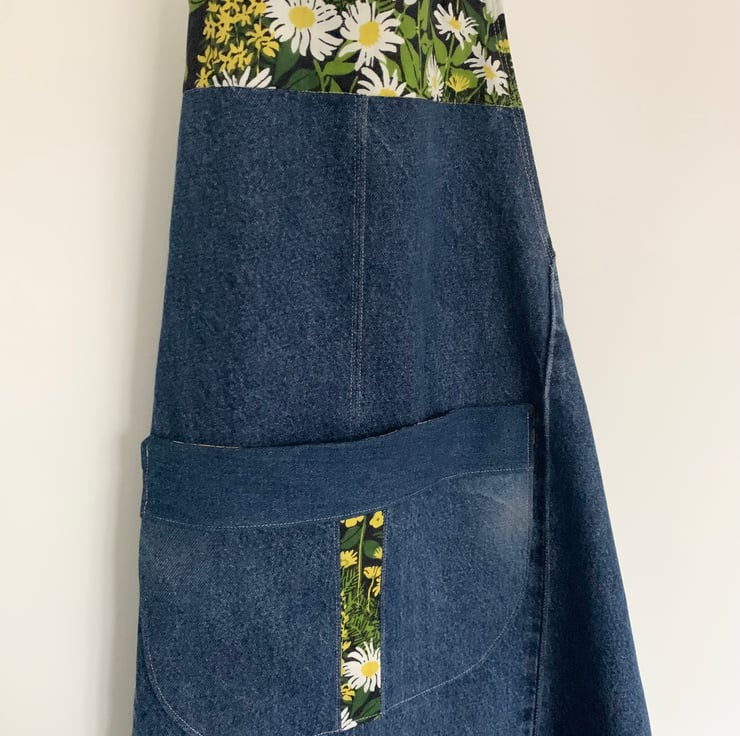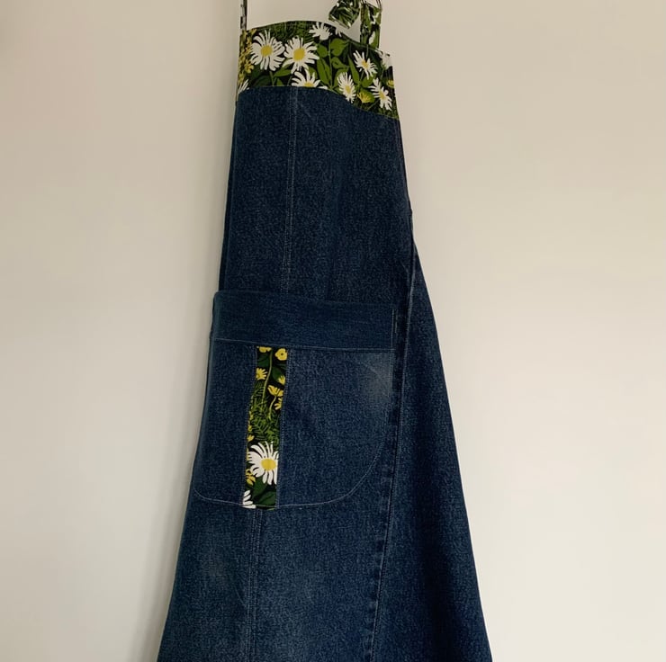 Unique apron made from a pair of jeans and retro seventies floral cotton fabric. The denim is softly worn and forms the main part of the apron. A splash of colour is given by the vintage floral cotton which is used for the straps, across the top and on the pocket.