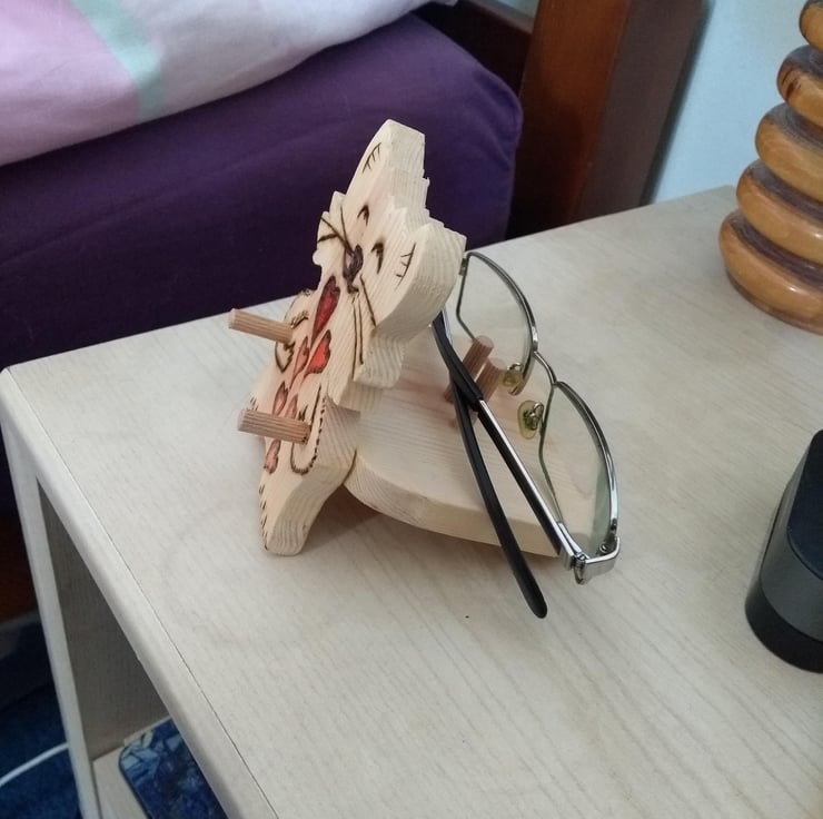 I fancied making some phone holders with a glasses stand.... my daughter uses one... these are being offered to a new owner...I had fun making it... low tech pine and dowel with phyrography and a touch of red paint...