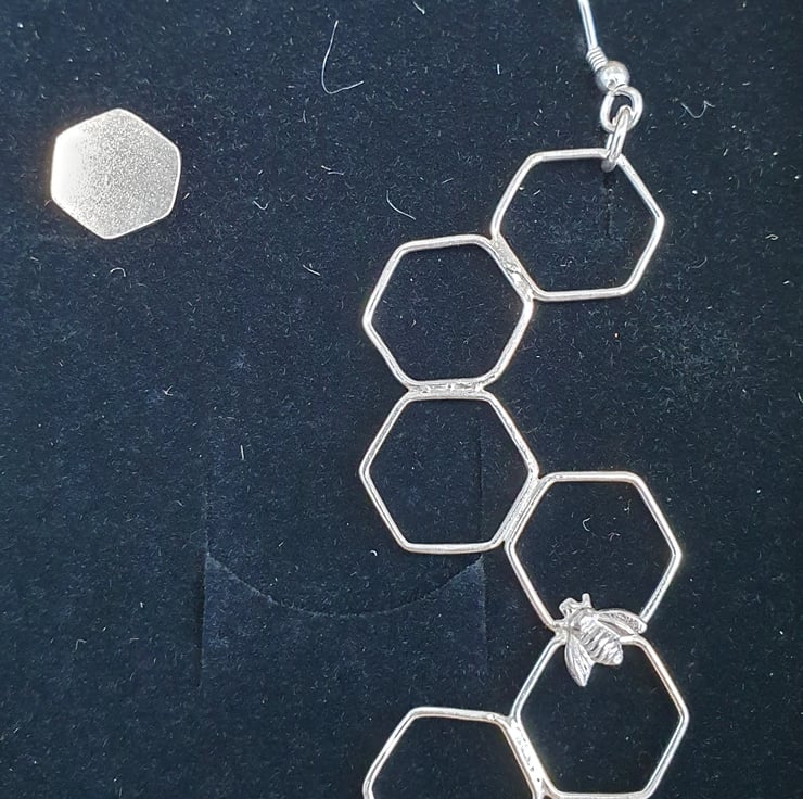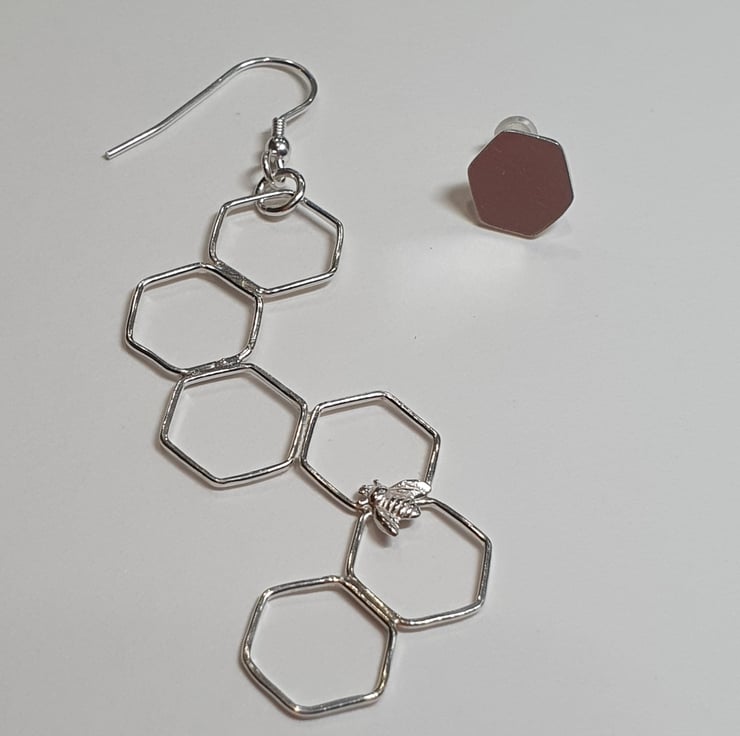 Sterling silver earrings made in a small Sheffield studio. These earrings are deliberately different but work together as a compelling statement. The long earring measures 7cm and each hexagon is made from 0.8mm sterling silver wire and is 1.3cm at the widest point. These is a small sterling silver bee soldered onto the honeycomb. The stud earring is made from 0.8mm sterling silver sheet and measures 1cm at the widest point.