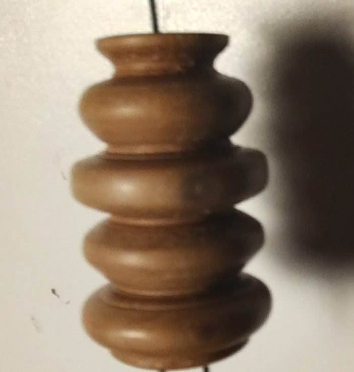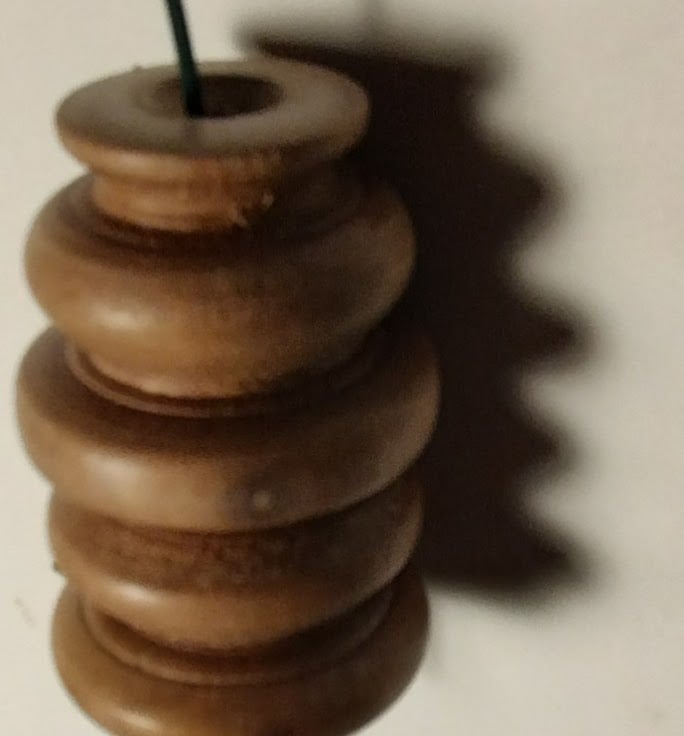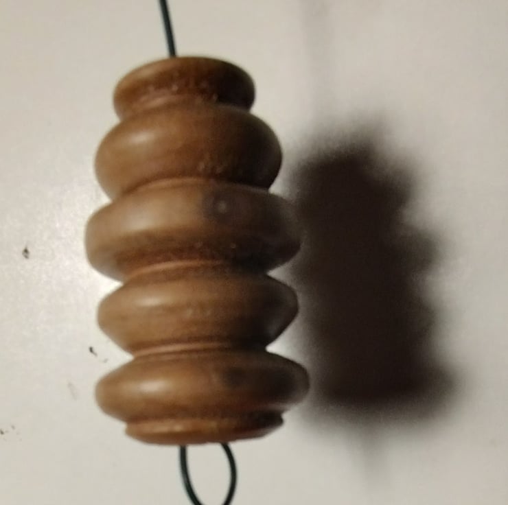 A wood turned piece of apple wood with a 3mm hole through for a light pull string. Finished in wax. Note one end the hole is not quite central...ho hum...