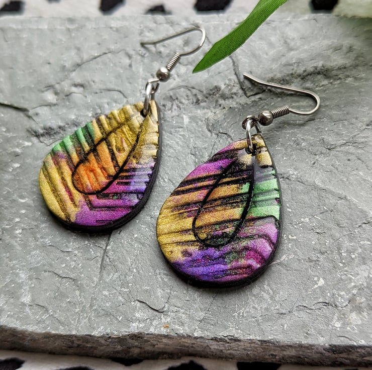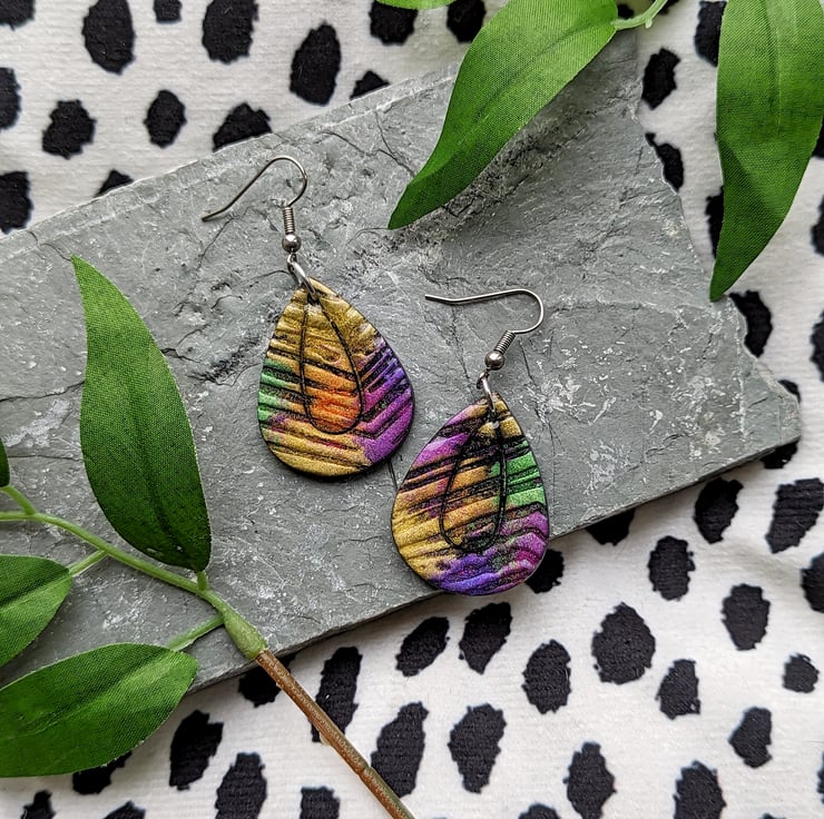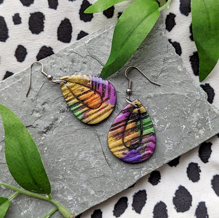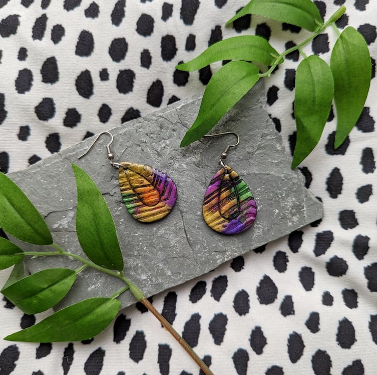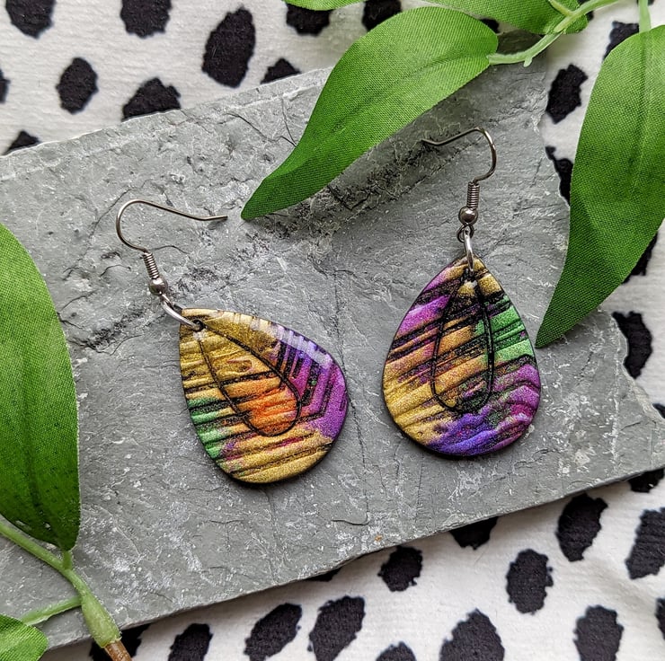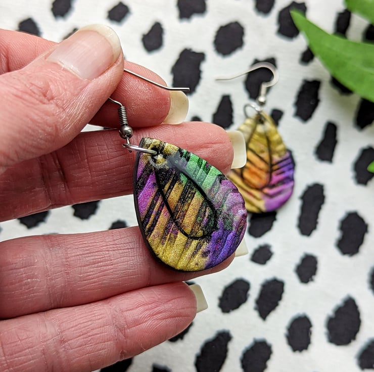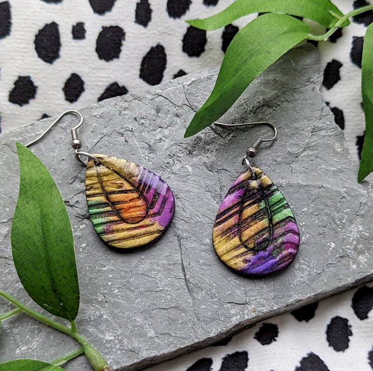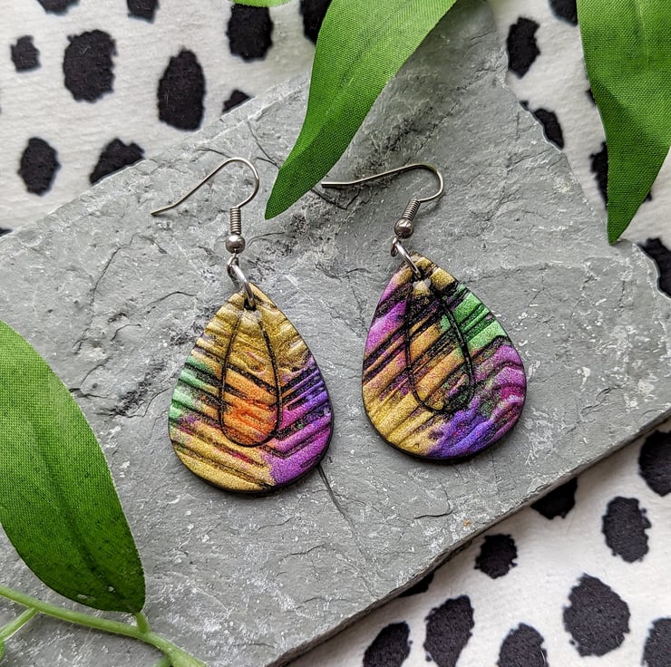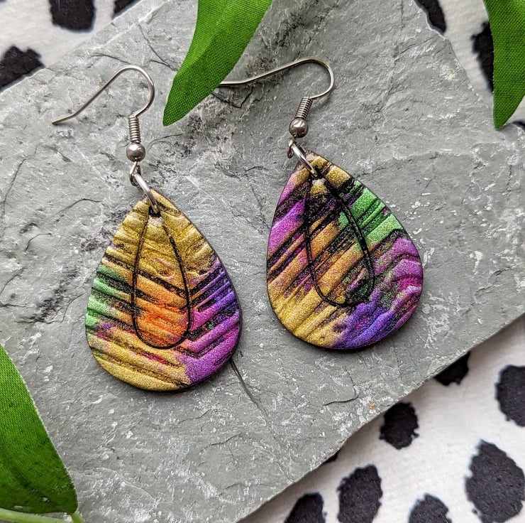 A black polymer clay base canvas, with a texture tile providing crevasses it allows the colours and shimmer of the mica powders to dance and intermix providing an eye catching shimmer bursting pair of earrings.