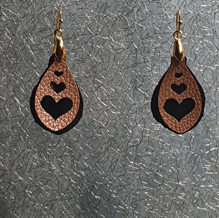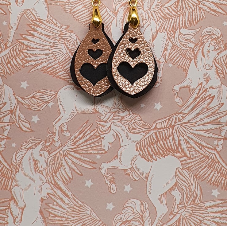 This is a set of black leather and champagne faux leather earrings with Heart shapes and gold drop stainless steel earring. Made with stainless steel. 5cm drop and 2cm wide. All my items are gift wrapped and can include a message if sending as a gift. Please send me a message with details if required, including the Item Title. My items are posted in an environmentally friendly recyclable jiffy bag.