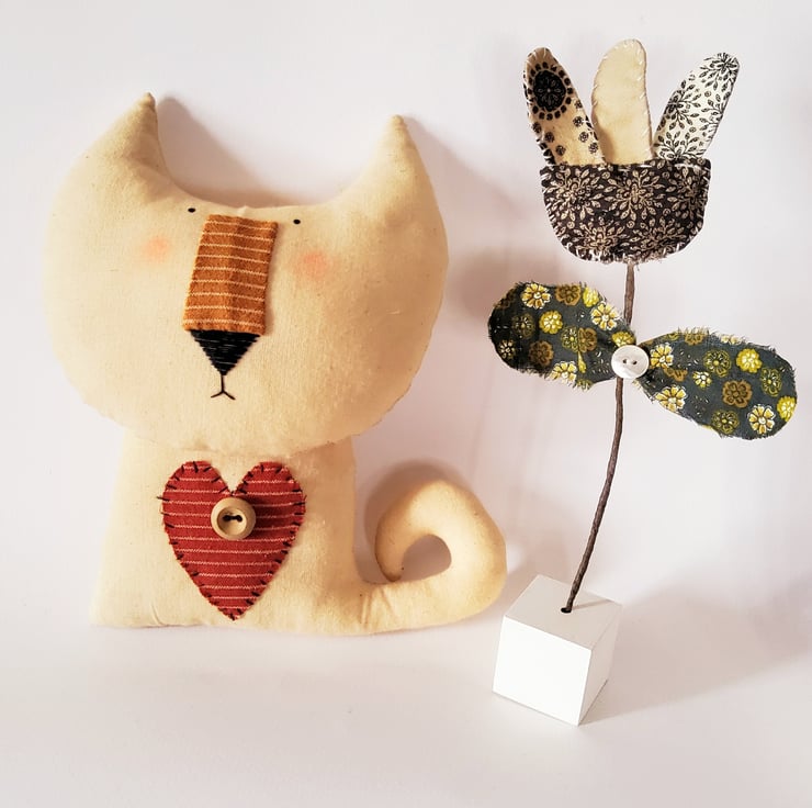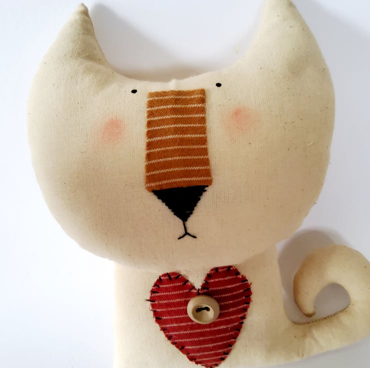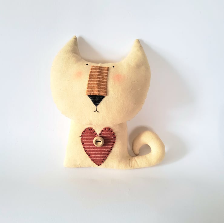 Prim cat is made from tea dyed calico,with painted eyes,embroidered and appliqued nose and a homespun fabric heart with vintage wooden button.