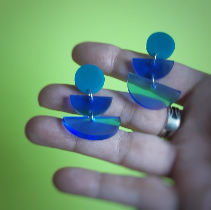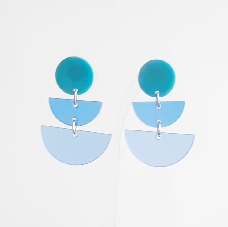 These handmade dangles are formed from 2 tiers of blue resin transparent semi circles hung from a blue green resin stud.