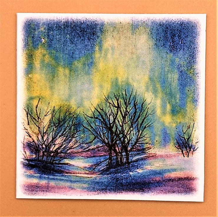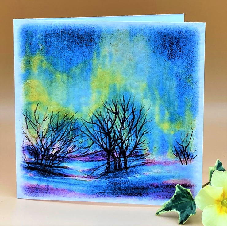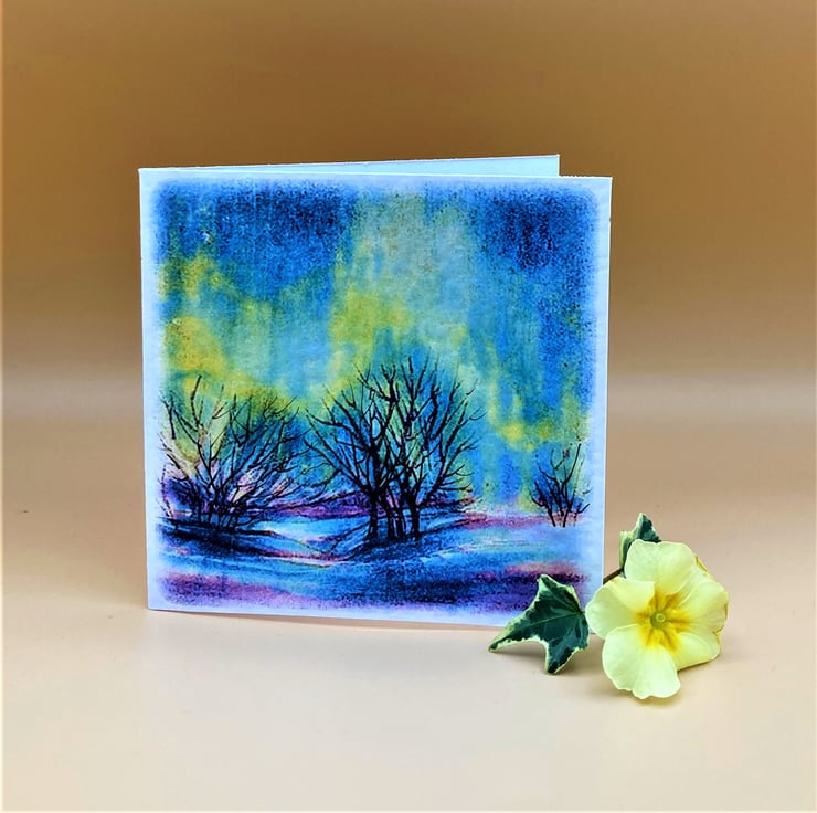 This colourful Northern lights greetings card is blank for your own message. Taken from one of my watercolours the card shows the Aurora Borealis flickering and dancing over a snowy Northern landscape. The colours are vibrant blues, yellows, and pinks with dark trees silhouetted against the glorious colours. A touch of hand applied pen detail is added to the card making each one unique. A truly magical sight the northern lights make a lovely subject for an any occasion card.