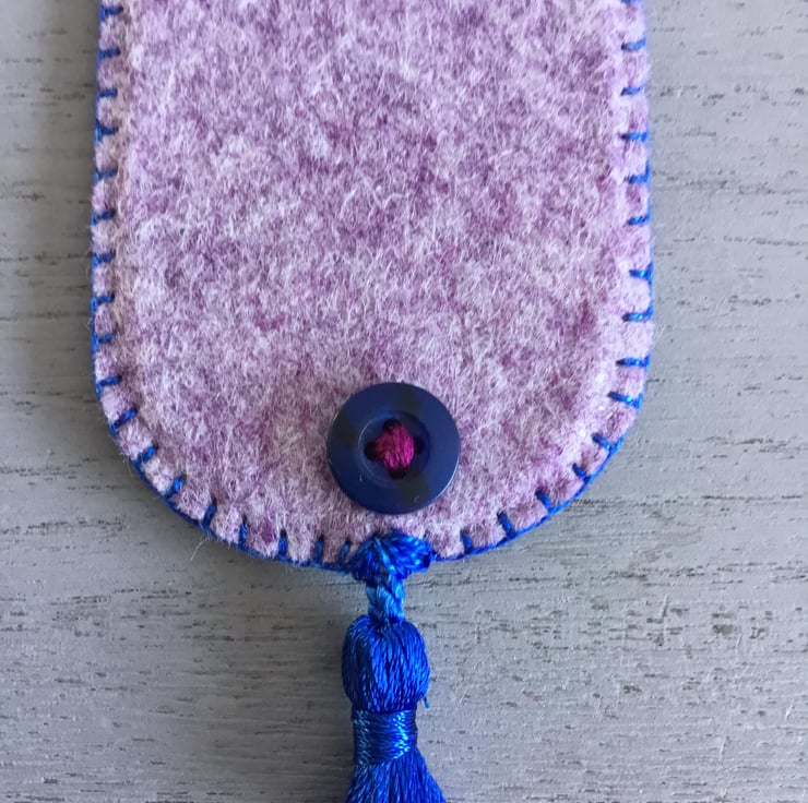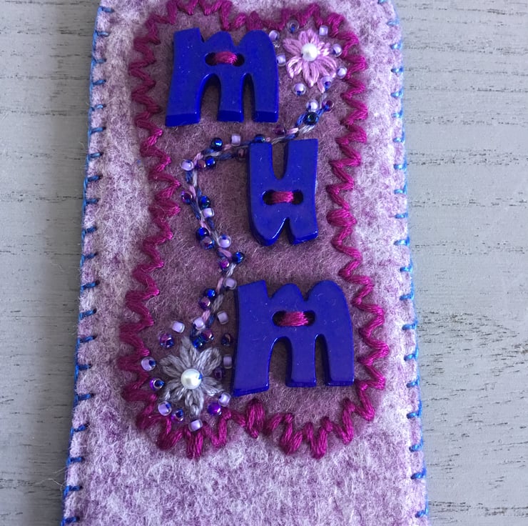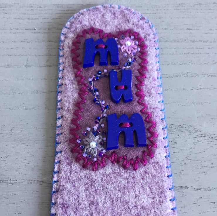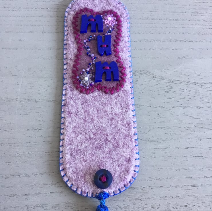 This Hand Embroidered Mum Bookmark is especially for Mum. The word Mum is written in blue Letter buttons, sewn onto marbled heather felt, edged with Fly Stitches in dark pink embroidery thread. A garland of pink flowers with pearl, pink and blue seed beads entwine the word Mum. This embroidery is on a marbled lavender felt bookmark, edged in blue Blanket Stitches. A small blue button and tassel are at the bottom of the bookmark.