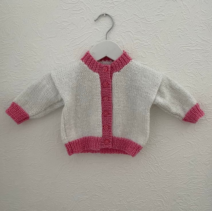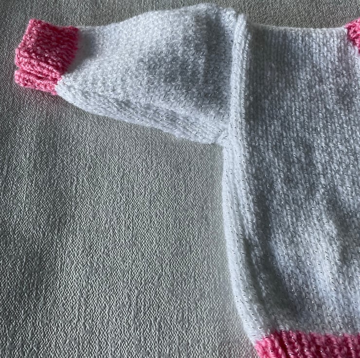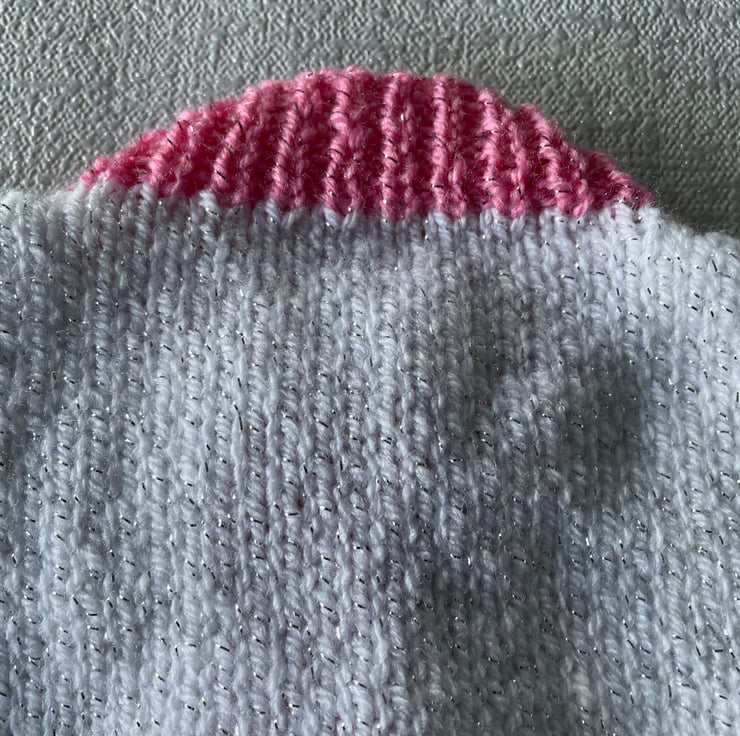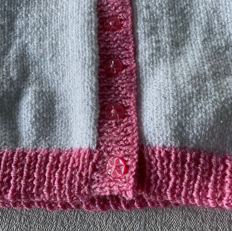 This hand knitted cardigan is worked in a glittery white and pink yarn. It has a round neck and fastens with six buttons The glittery thread in the white yarn is silver and in the pink, used for the bands and hems, it is pink.