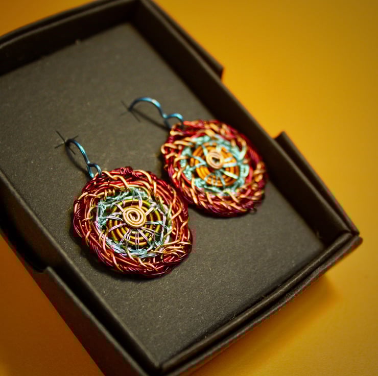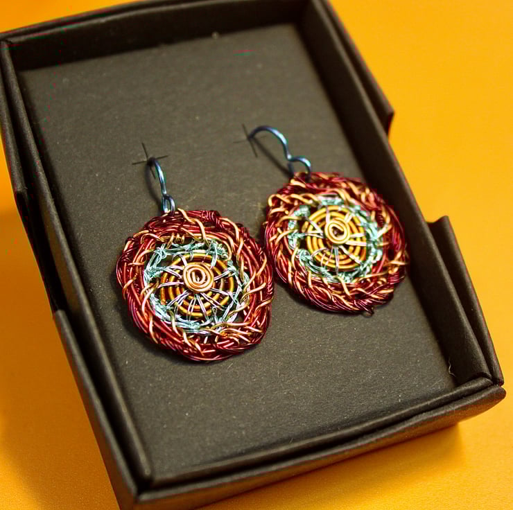 Red Edged disc earrings from lacquered wire and includes recycled materials, lacquered copper wire from televisions plus bought wire in pale blue and niobium hooks (ear wires).