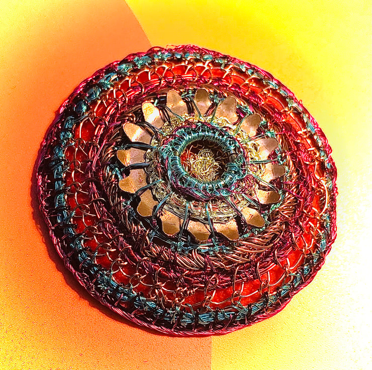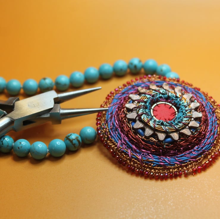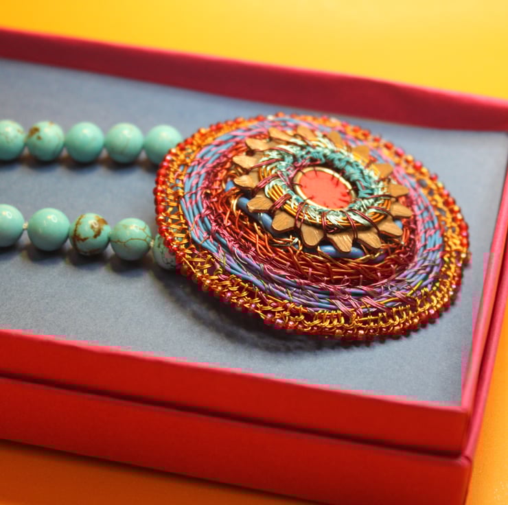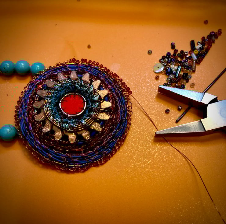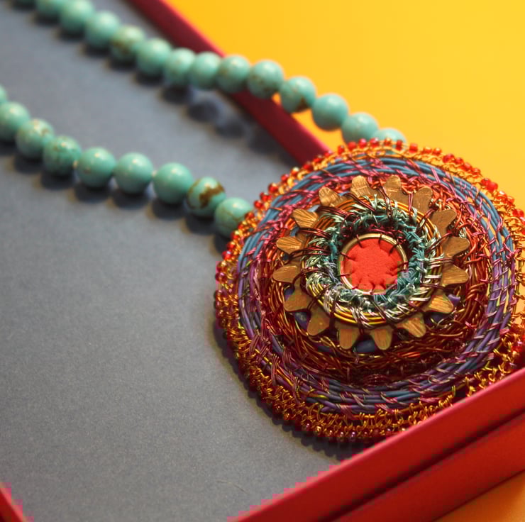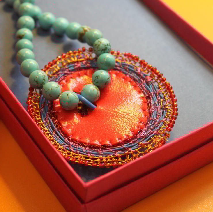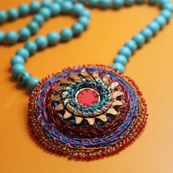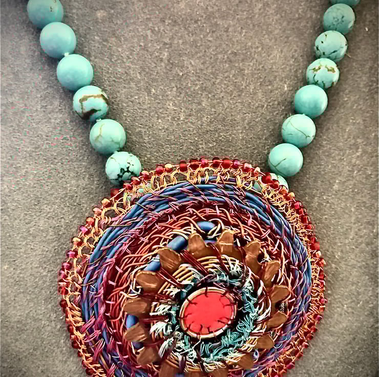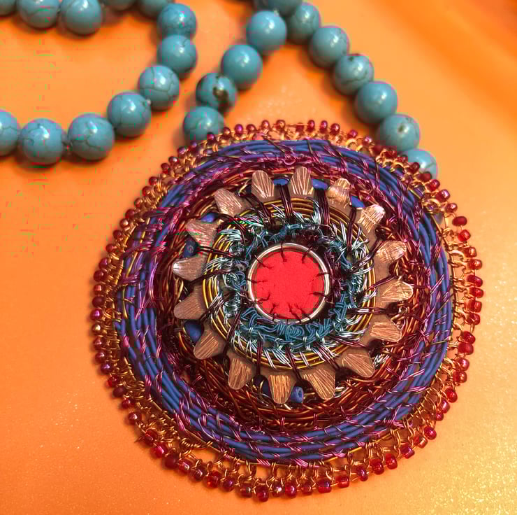 Celtic disk pendant on turquoise bead necklace - combining my recycled and urban foraged pieces with vintage turquoise beads (beautifully fold to touch, and knotted in between each bead. I have created the pendant from a donated piece - a serrated copper washer, with a large jump ring, rubber from red exercise ball, telecom wire and edged with vintage beads and stitched together with television wire.
