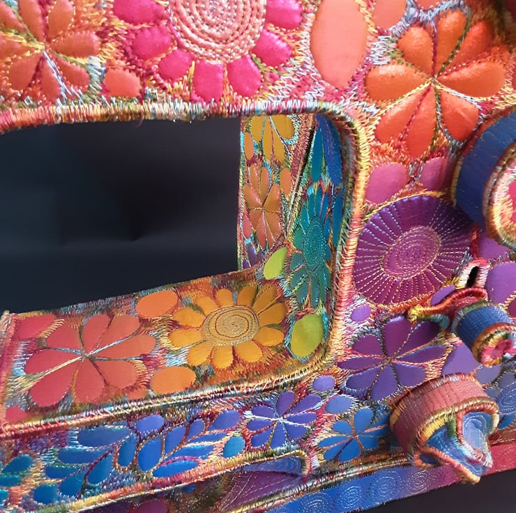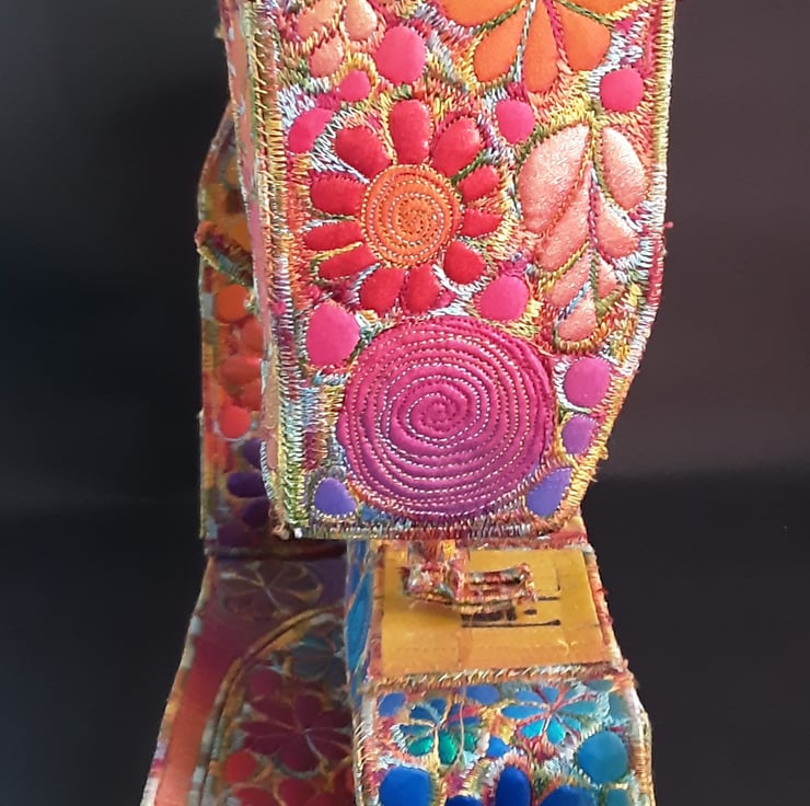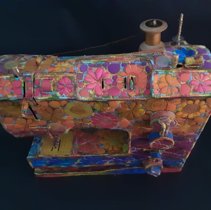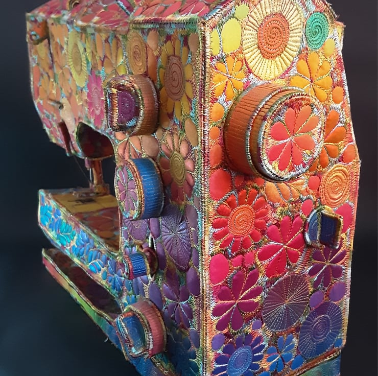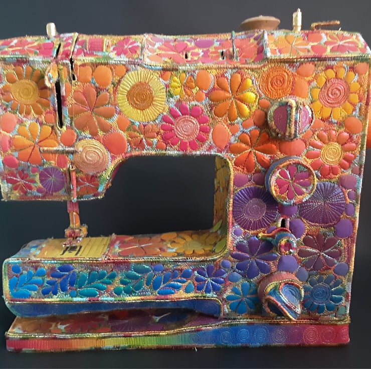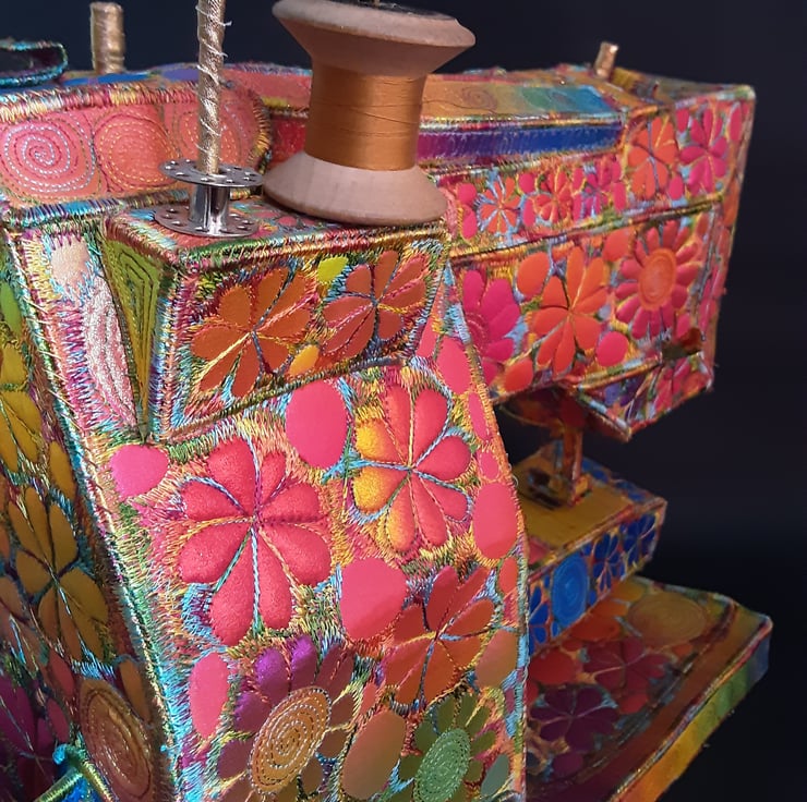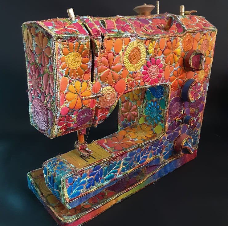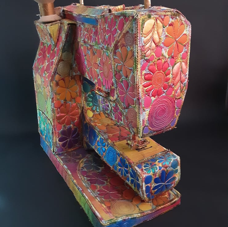 This is a life Size copy of a Bernina sewing machine done in my own style of sewing and construction with jewel like colours with applique and free machine embroidery.