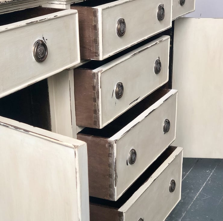 Chalk paint has been used on this piece: the chalk paint enhances the grain of the wood, giving the surface a material layer. The structure of the wood is solid and there are no damages (just a small stain inside a drawwr). The inside has been cleaned and treated with oil as the back too.