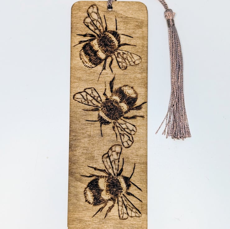 Three bumble bees have been lovingly hand burnt onto this wooden bookmark using pyrography and it has been stained with a light oak colour and finished with a coat of satin varnish and a tassel.