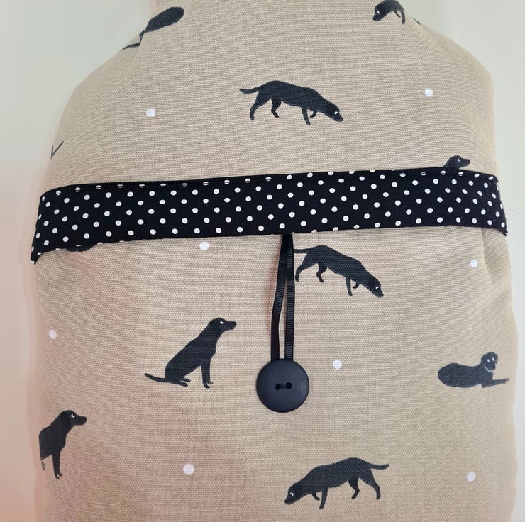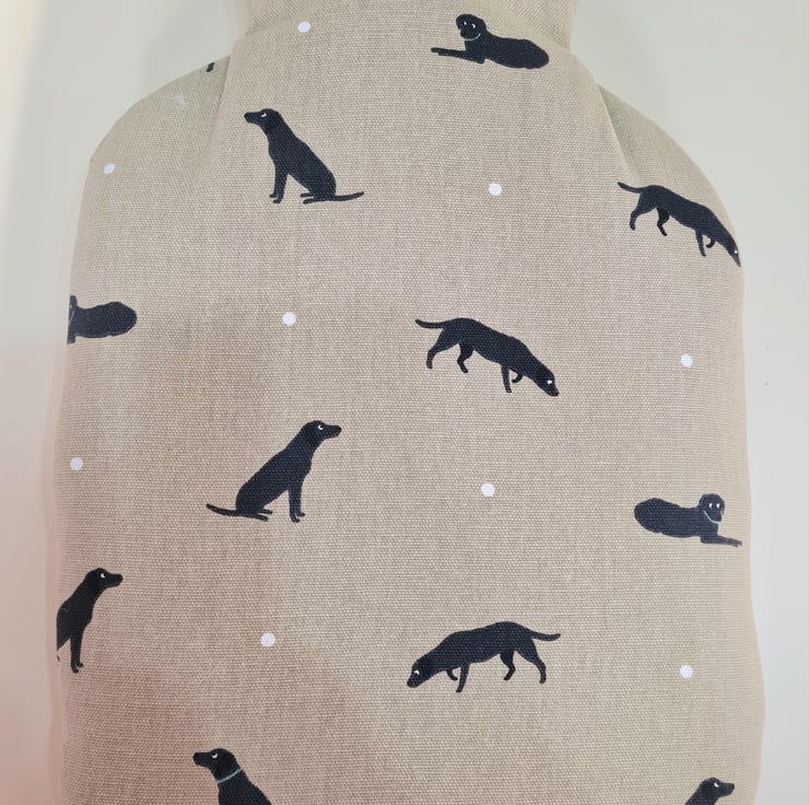This is a handmade hot water bottle cover (comes with a 2 litre hot water bottle ) made in Sophie Allport Black Labs fabric .
