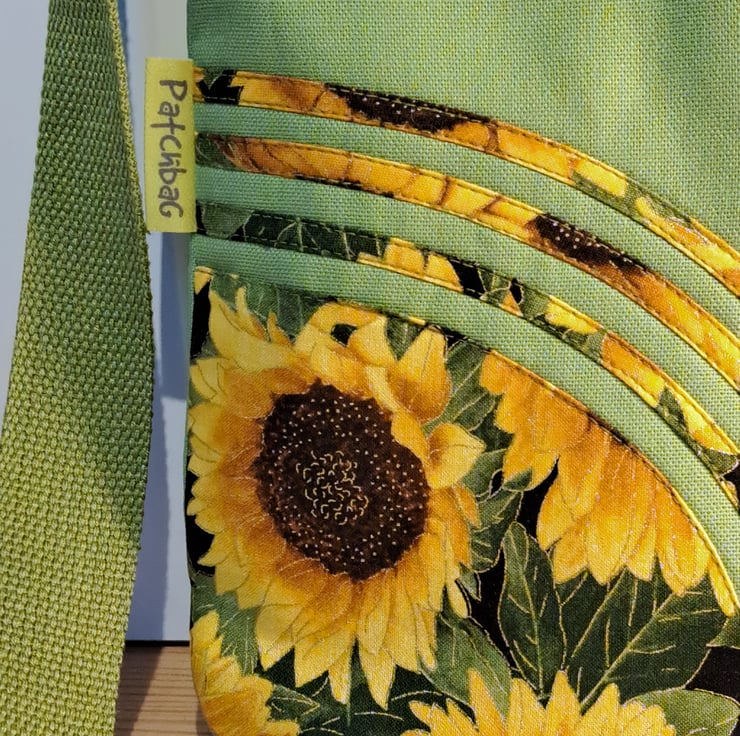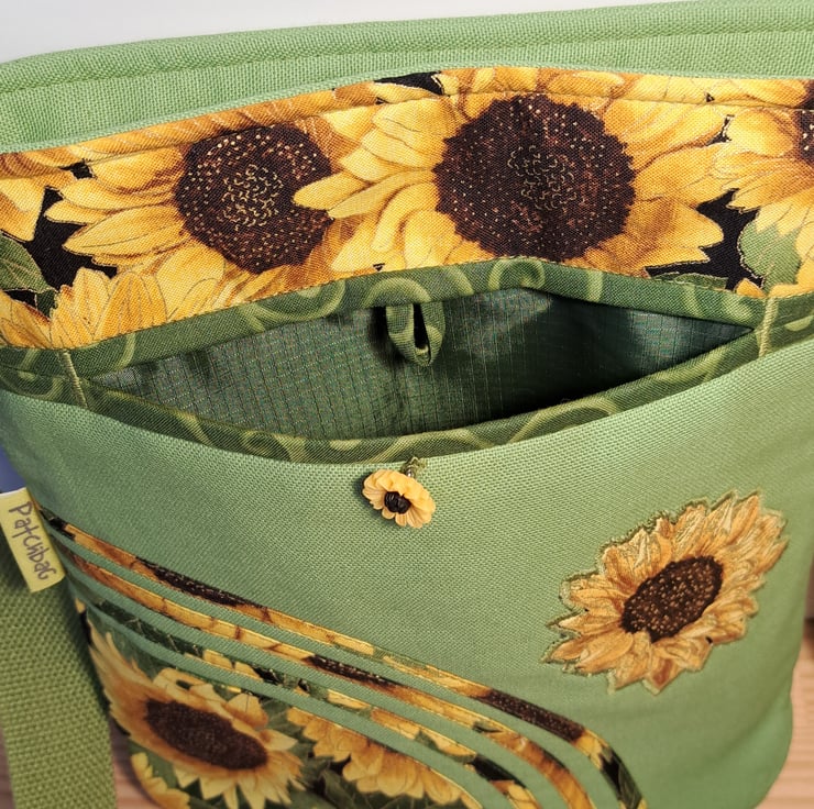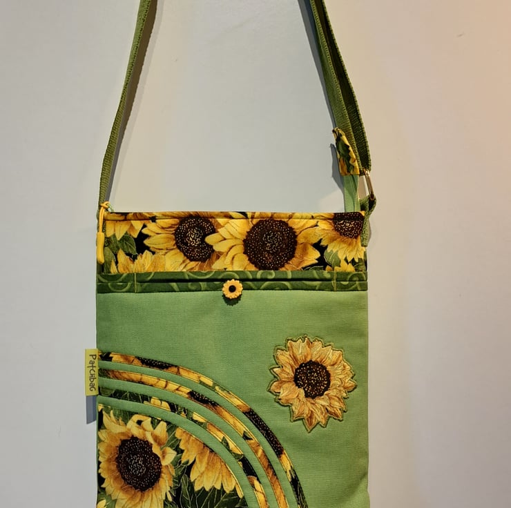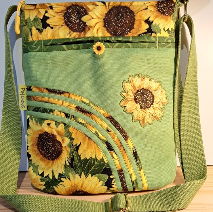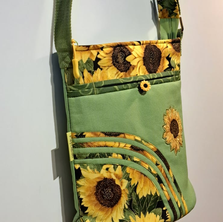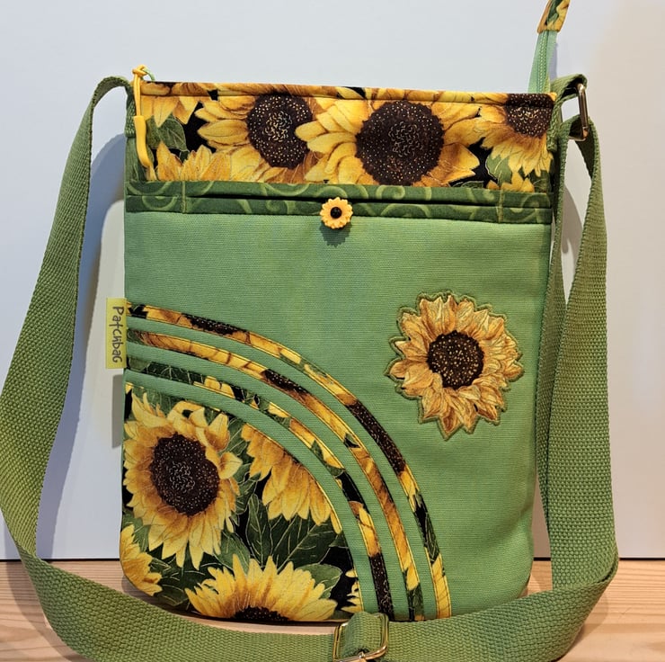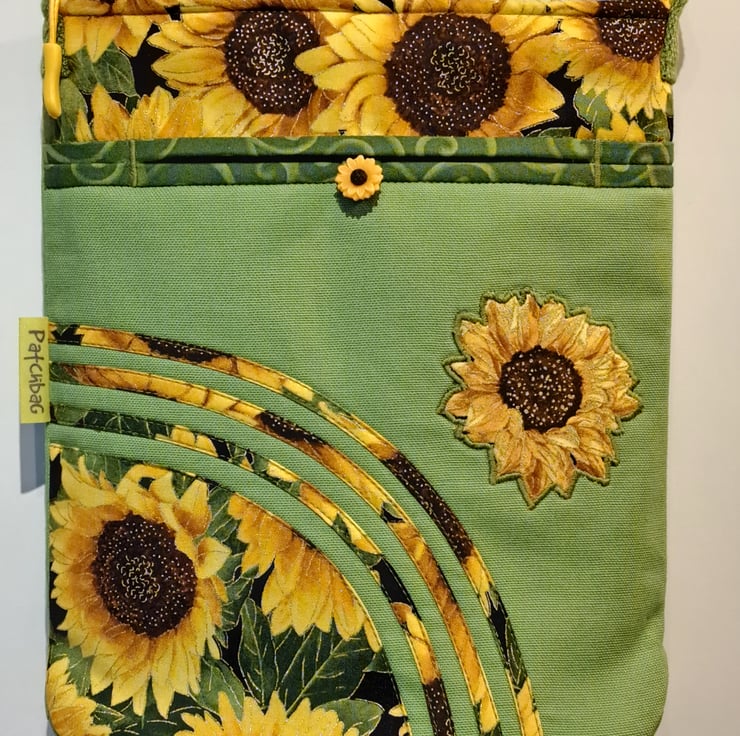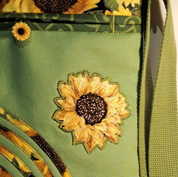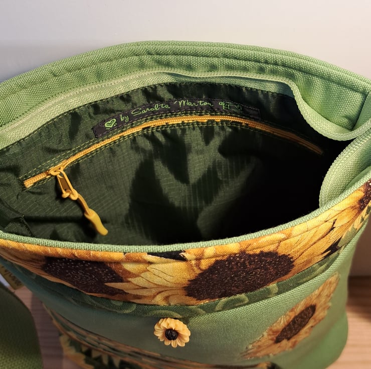 Sunflowers pattern patchwork ,quilting and applique handbag. The lightweight shoulder bag made from lime green canvas fabric,decorated with cotton fabric. The wonderful sunflower fabric what I used for my bag from Timeless Treasures collections. The pattern contents golden metallic details. The unique handcrafted bag has outside pocket with sunflower button and also has inner pocket with zip closure. The lining of the bag made from WATERPROOF fabric. The shoulder strap is adjustable with golden metal clasps. The dimensions of the bag: hight 27cm, width 24 cm,depth 7cm on the bottom of the bag. The shoulder bag closing with zip on the top .