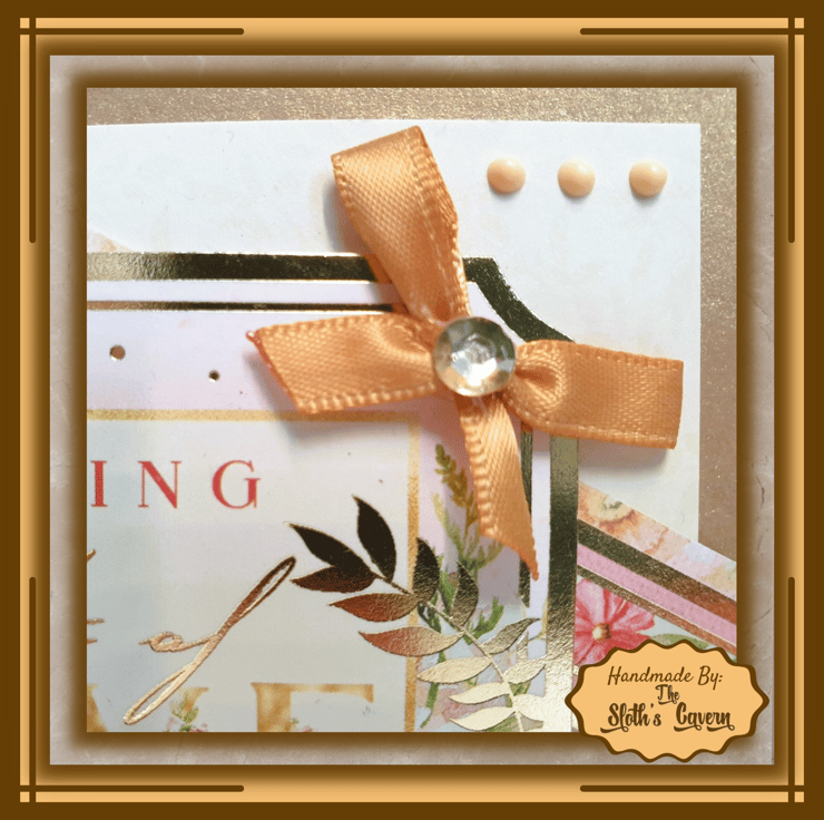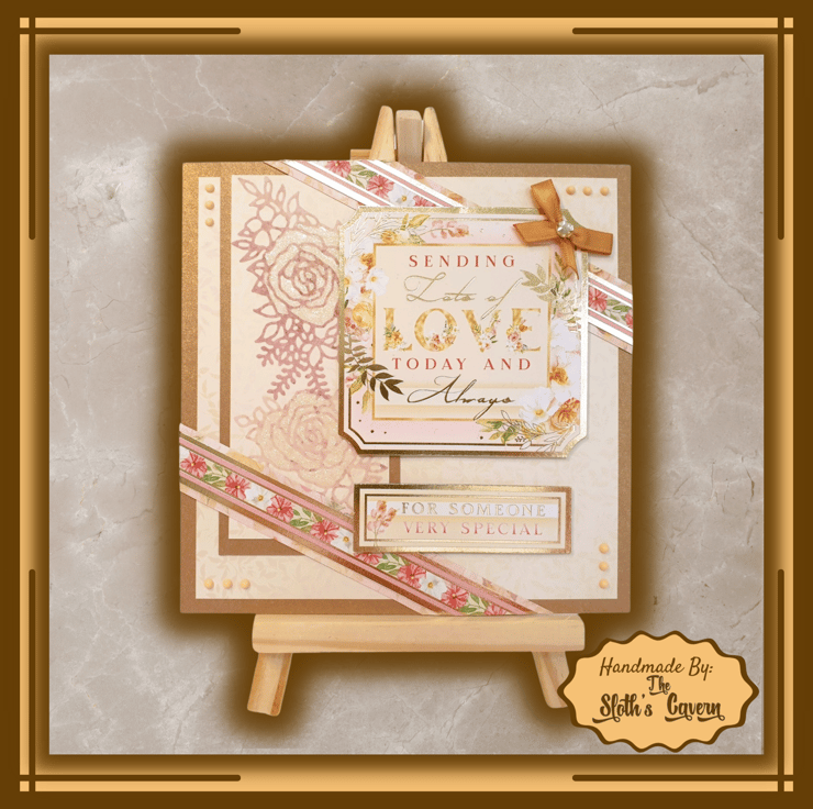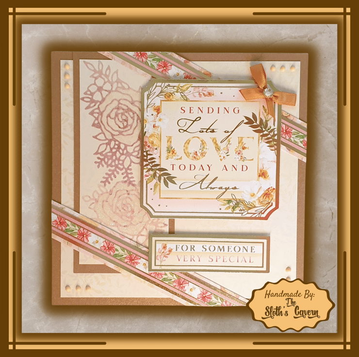 The square gold foiled topper with a floral pattern that displays the message "Sending Lots Of Love Today And Always" and the sentiment "For Someone Very Special" are both mounted on the card with foam pads. A gold-brown ribbon bow with an embellishment gem, lies on top of the square topper.