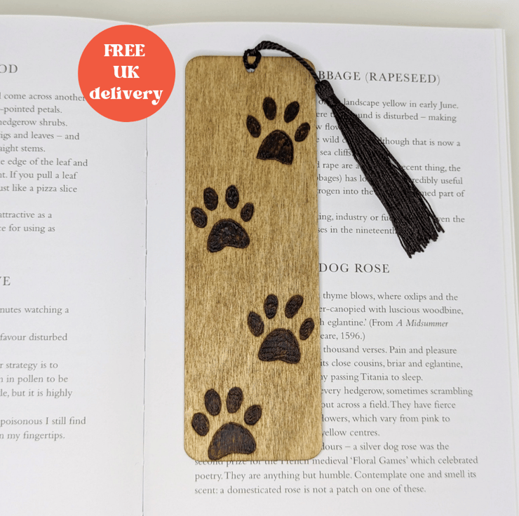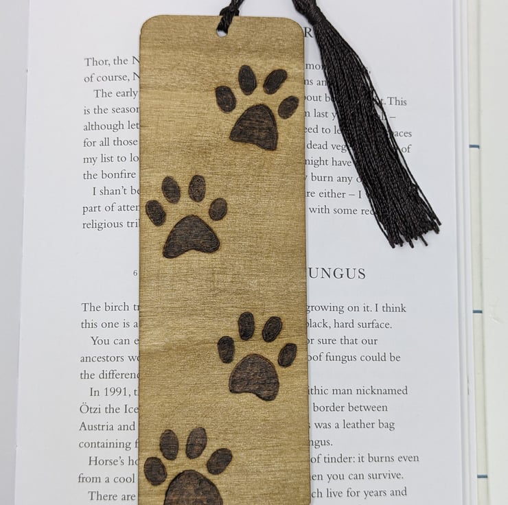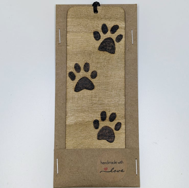 Wooden bookmark which has been hand burnt on both sides with 4 paw prints using the art of pyrography and stained with a light oak colour. The bookmark has been finished with a tassel and comes supplied in cardboard packaging. A lovely way to save the page this unisex bookmark would make a great gift for a dog or cat lover.