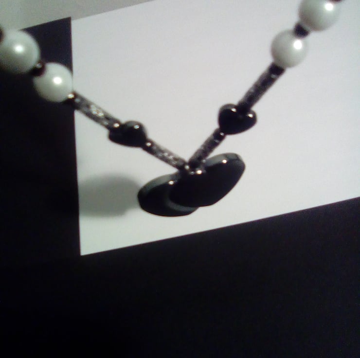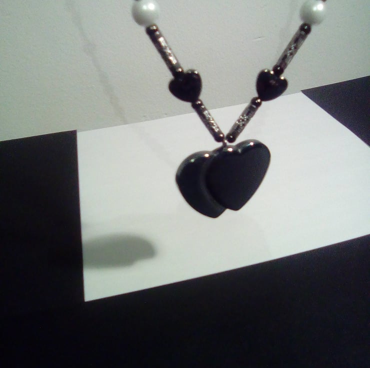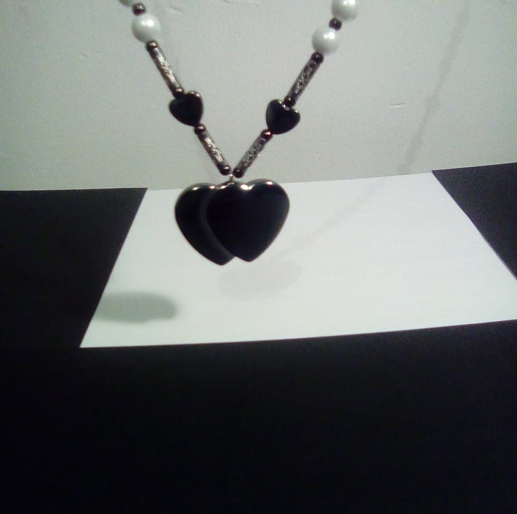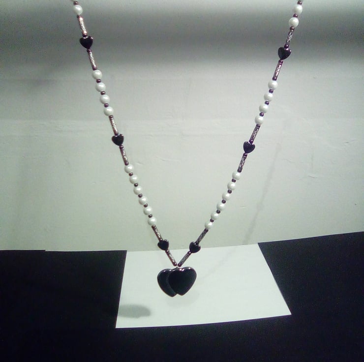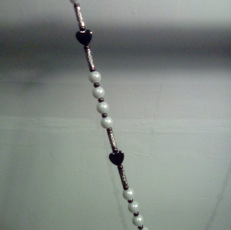 white glass beads heart is iron stone column's are stainless steel, Total length is 12 inches, I can change the length