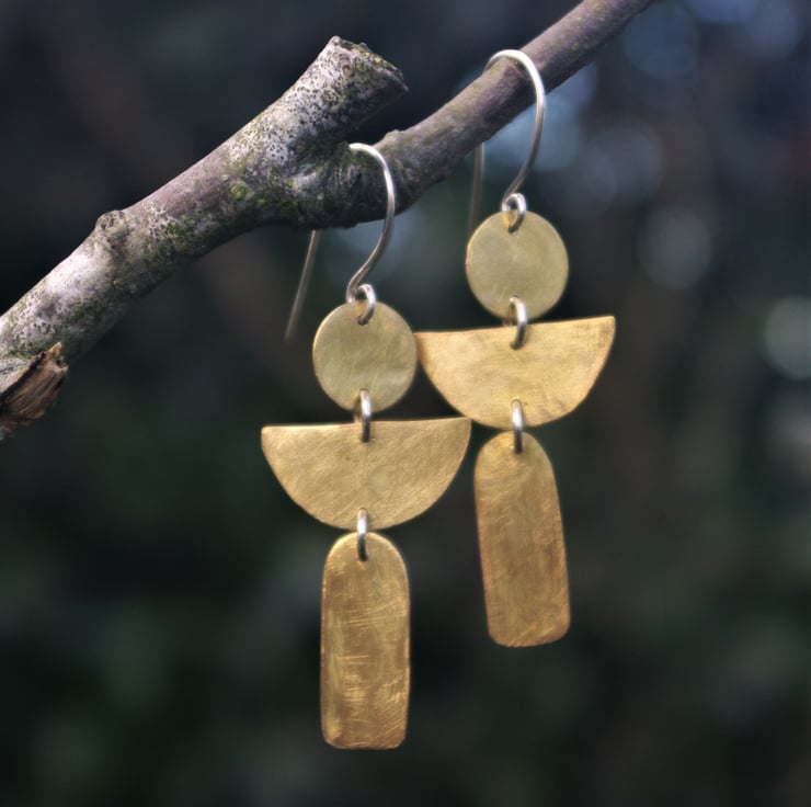 I have cut out shapes in brass and attached them together with sterling silver jump rings. The top shape is a circle of 11mm diameter; the middle is a half moon shape 20mm wide and the bottom piece is arch shaped; 21mm in length. All pieces have a matt/frosted surface texture. The total dangle is 58mm/ 2.25 inches from the top of the ear hook.