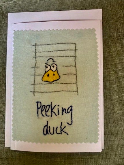 This "peeking" duck peering through the shutters has been hand embroidered onto calico material and mounted onto a 4" x 6" white greeting card. The card has been left blank inside for your own message. Chopsticks not included!