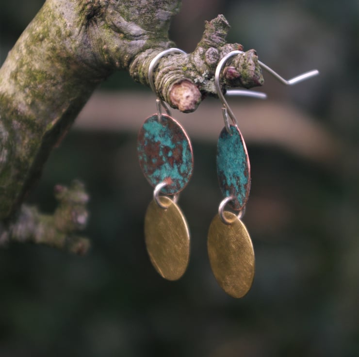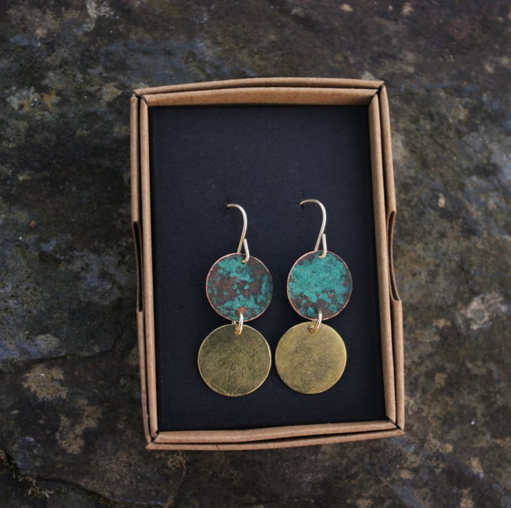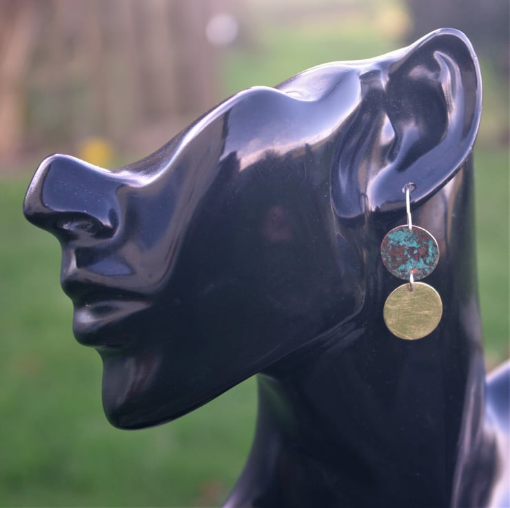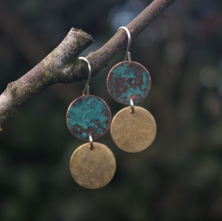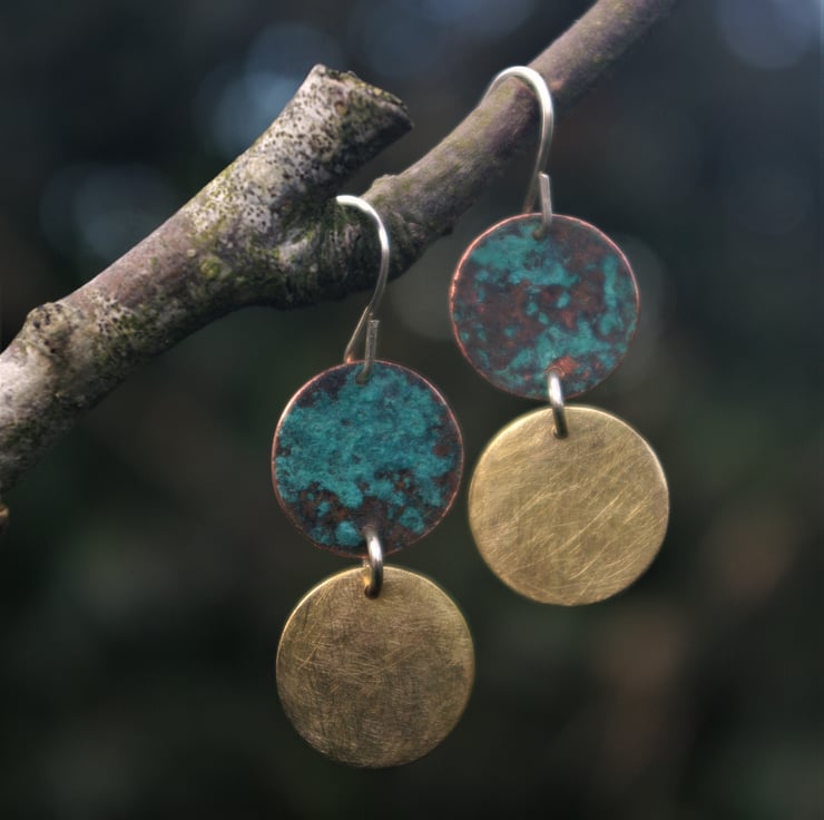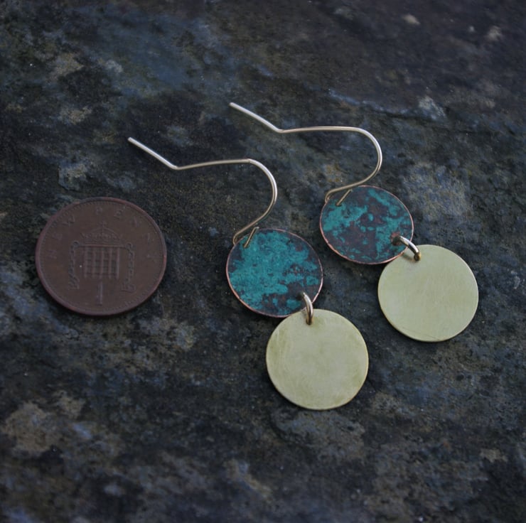 I have cut out circles in copper and brass and created a blue/green verdigris surface on the copper to contrast with the golden yellow of the brass. The brass circle is 20mm in diameter ; very slightly larger than the verdigris disc.