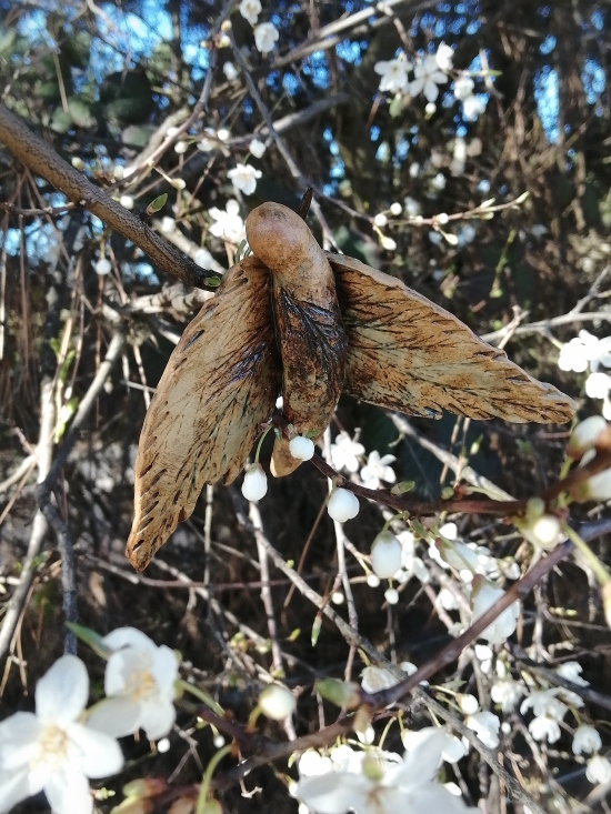 The wings of this Nature Sprite have been created by impressing Pine Fronds from my own garden into the wet clay.
