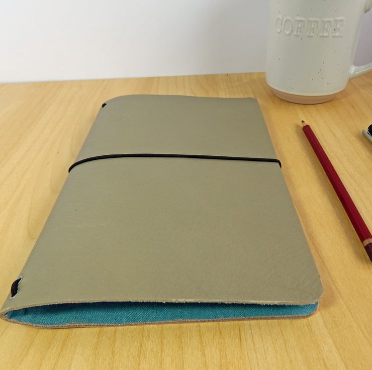 A lovely Leather Notebook Cover Gift Set, in grey and aqua, with two A5 notebooks.