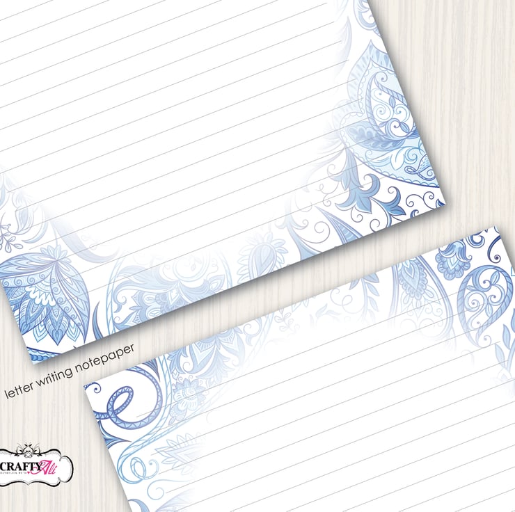 A set of 10 sheets of A5 size handmade letter writing / notepaper set with a lovely blue paisley pattern around the edges. Pretty notepaper!