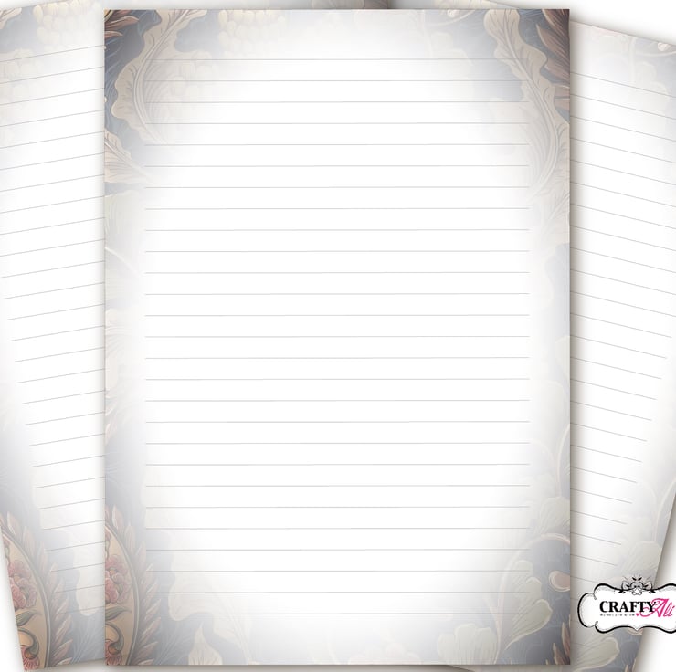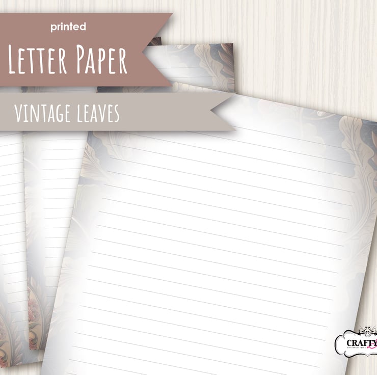 A set of 10 sheets of A5 size handmade letter writing / notepaper set with a feint vintage leaves pattern in the corners.