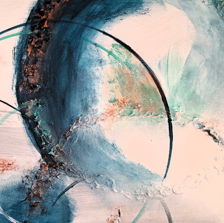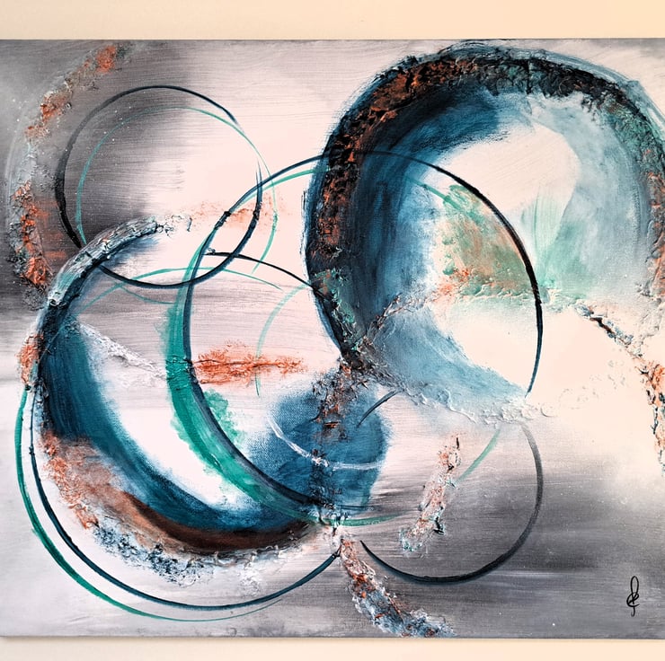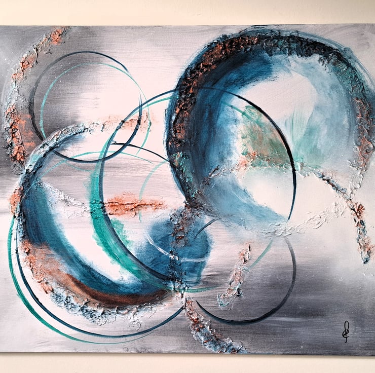 Hours of fun and enjoyment were spent designing this multi media artwork for which I created different sizes circles (using pan lids and plates), overlaying them and the use modelling paste to create texture and interest whilst defining parts of the circles. A very tactile piece of art.
