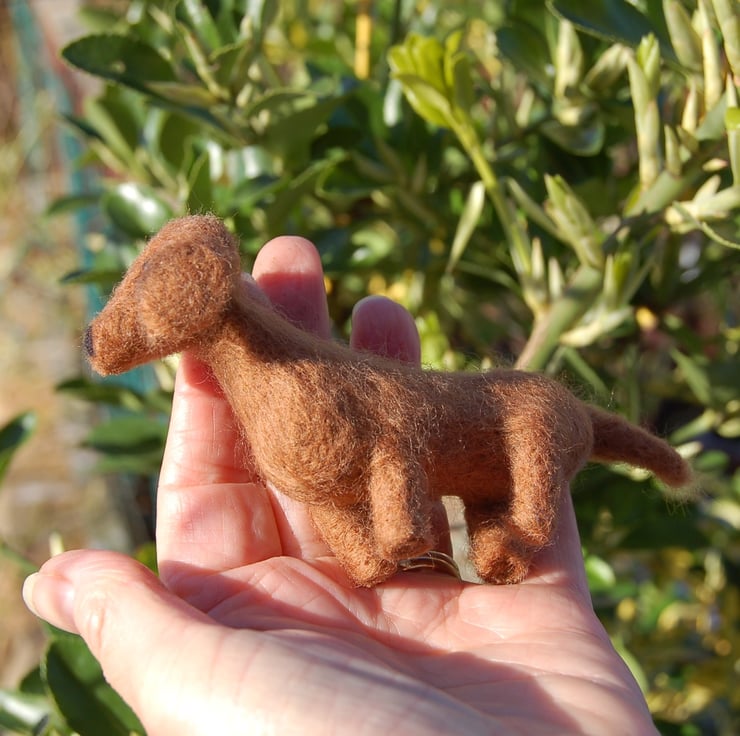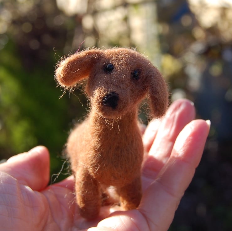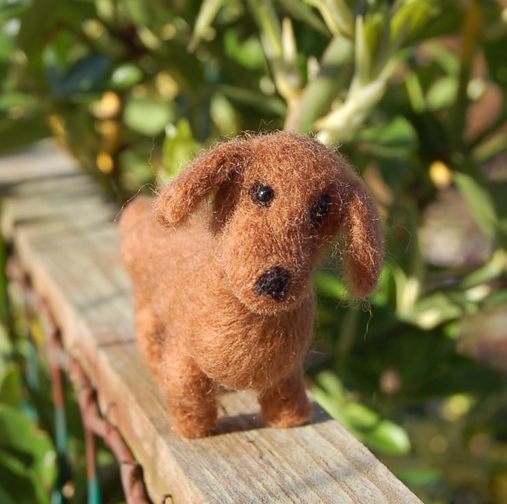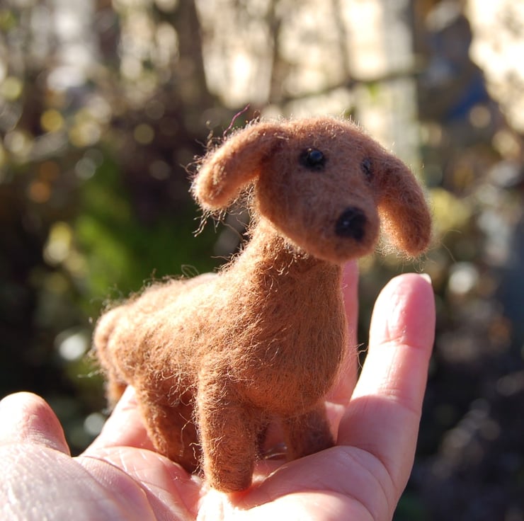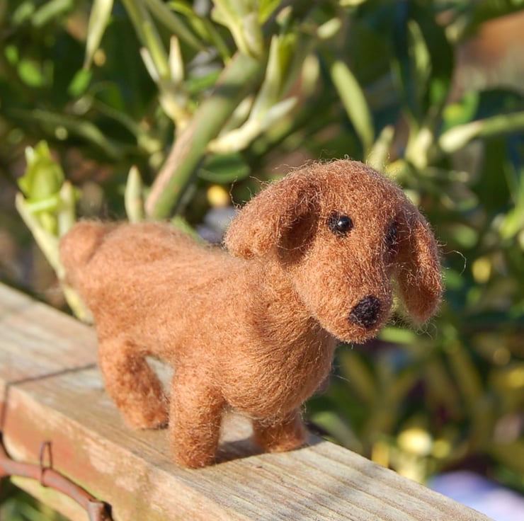 Such a cute winsome little Dachshund face on this needle felt wool dog. I love him/her/them.